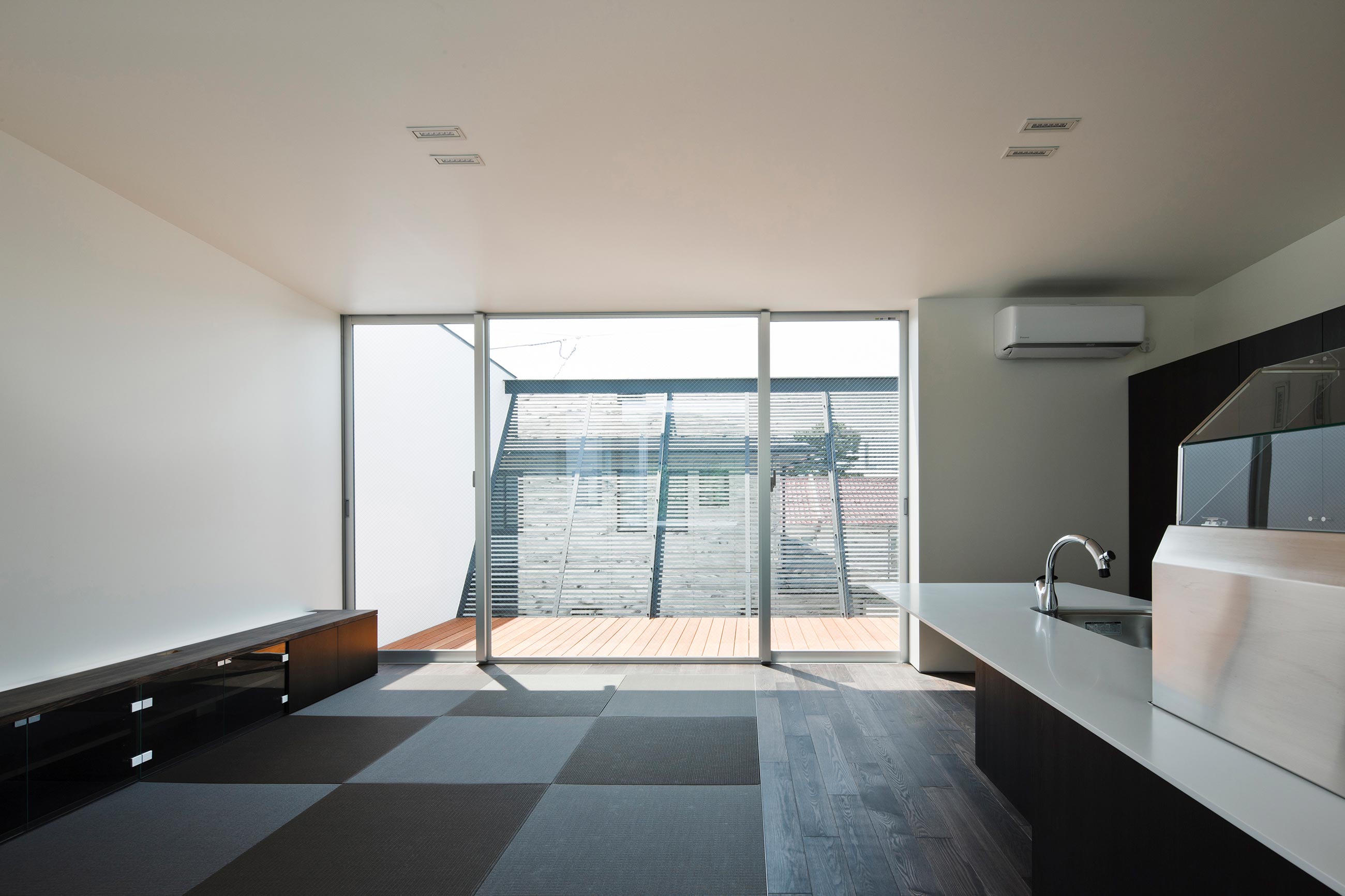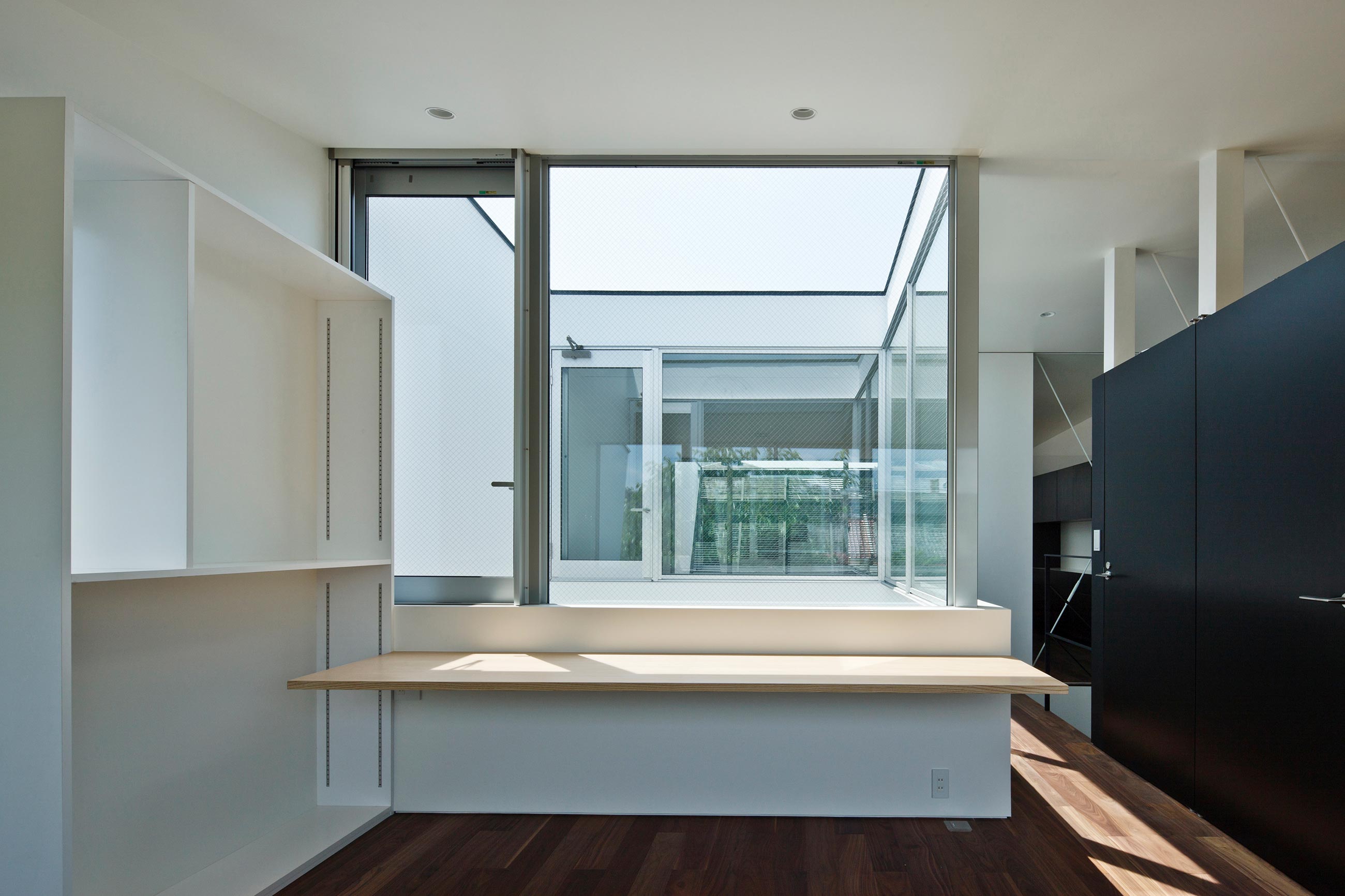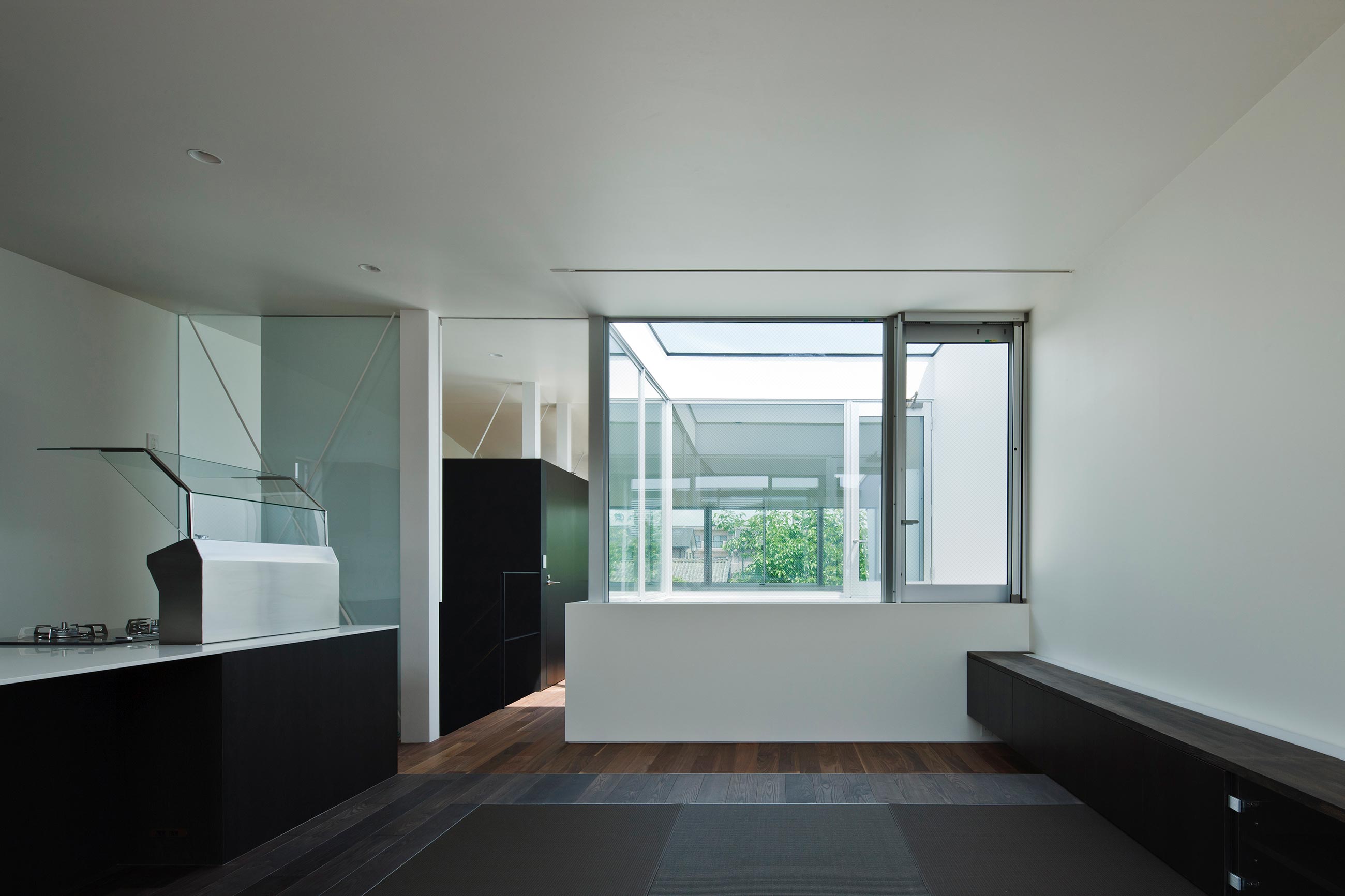 The garage lay open space for the masters cherished car and the wifes medium sized bike. LIFT became an peculiar cantilever volume stretching out obliquely into the sky. The second floor holds a court yard in the center which provides open space in the compact volume. From the living room with the face-to-face kitchen and the dinning space for lying on the floor, the borrowed scenery of the court yard and the balcony provides placid atmosphere. LIFT gives deep perspective in its compact volume. An open urban lifestyle would be there.