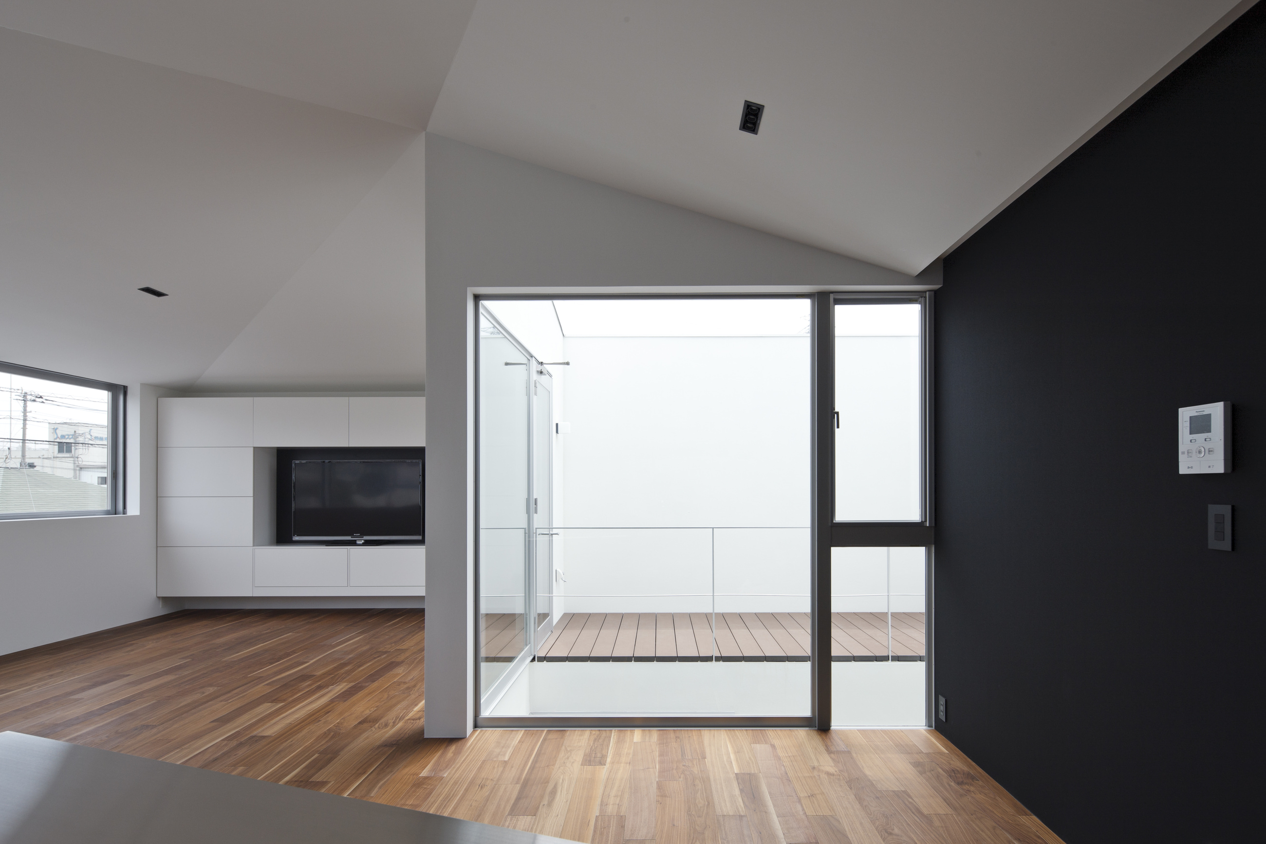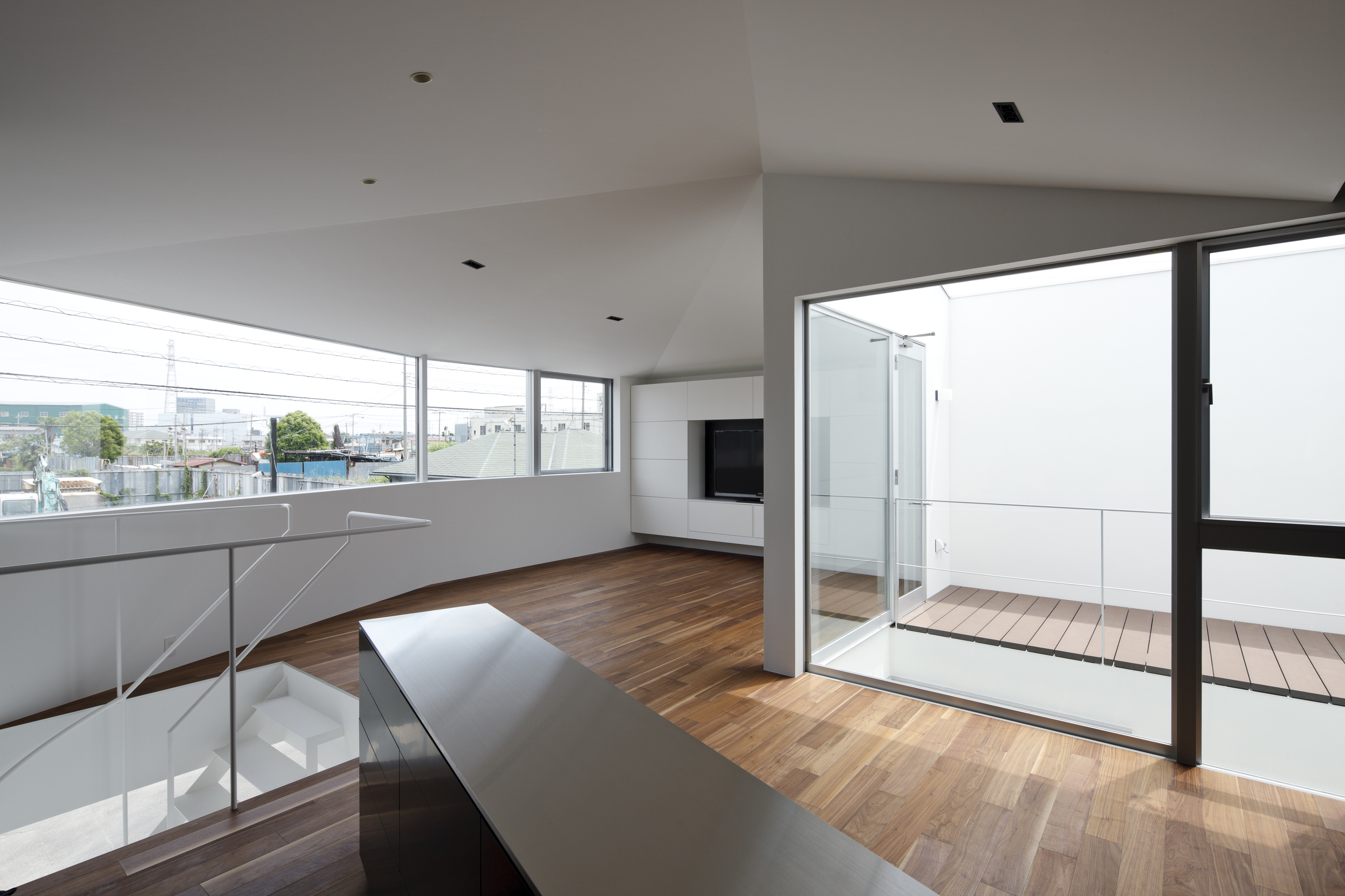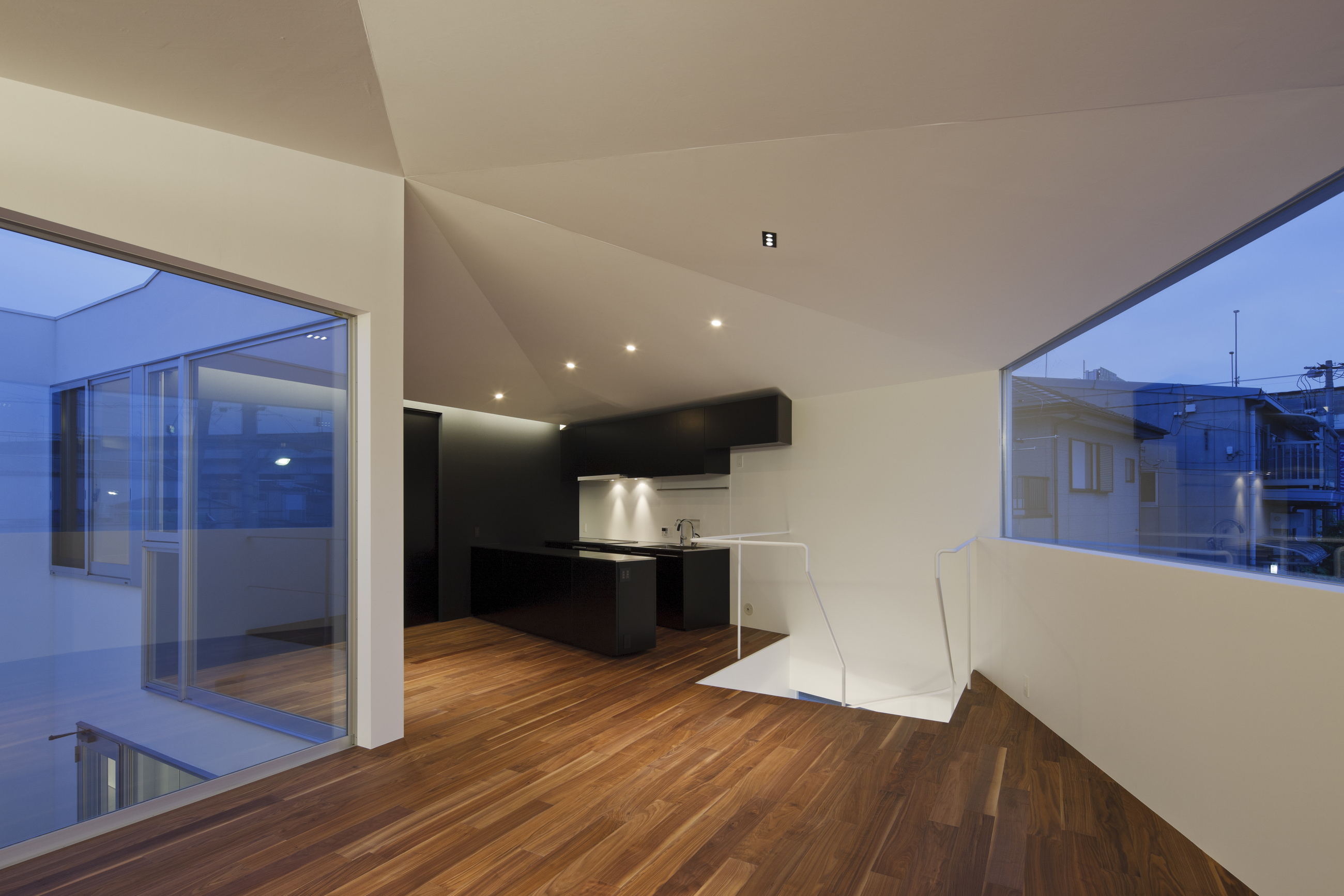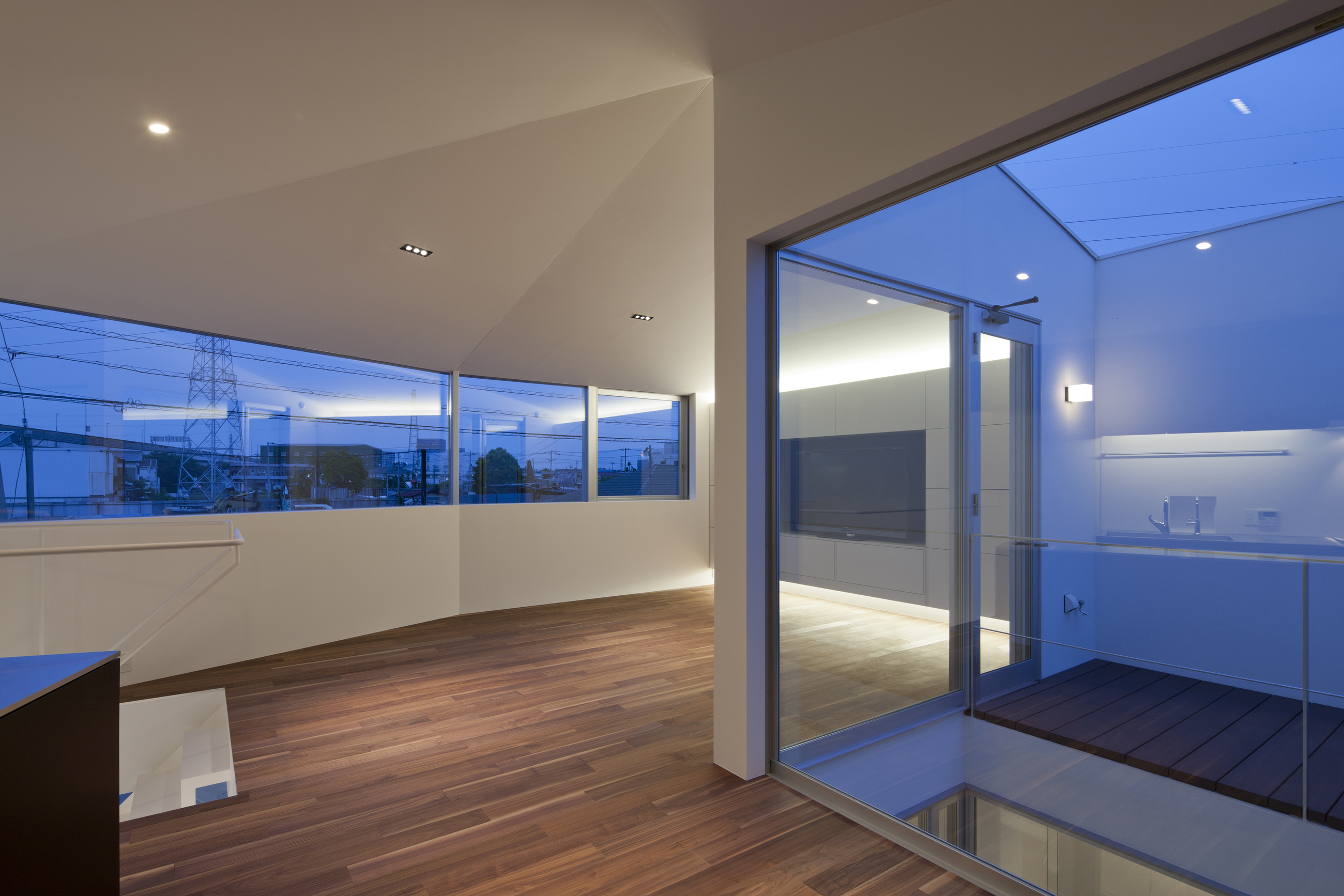 この光庭を共有する形で構成された2階はボディールームが付随したワンルーム形式で、L型型の平面と勾配天井が大らかな空間をつくりあげている。水平連窓によって北側の公園が借景となるだけでなく、南東側はいかなる隣家が建築された場合でも、全ての部屋が外の景色を存分に楽しむことができるように計画された。