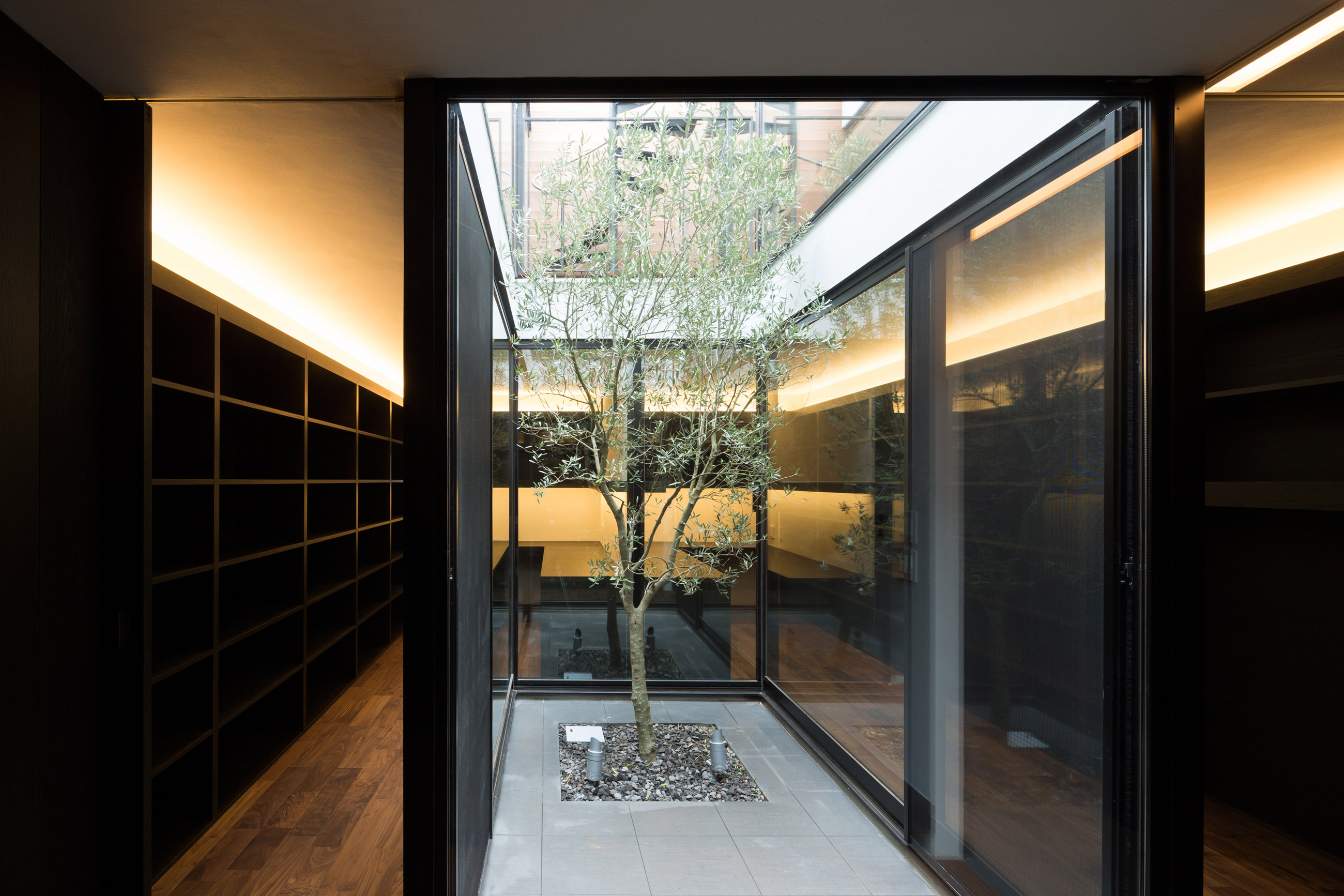 敷地奥の1・2階には夫婦の書斎ならびに各子供室を配し、細長い空間を生かした造作家具を壁側に設えることで、中庭に植えたシマトネリコを全室から眺めることが可能にした。各部屋には中庭からの柔らかい光が充満し、家族が互いの気配を感じ合いながら、勉強や仕事に集中できるのが特徴だ。