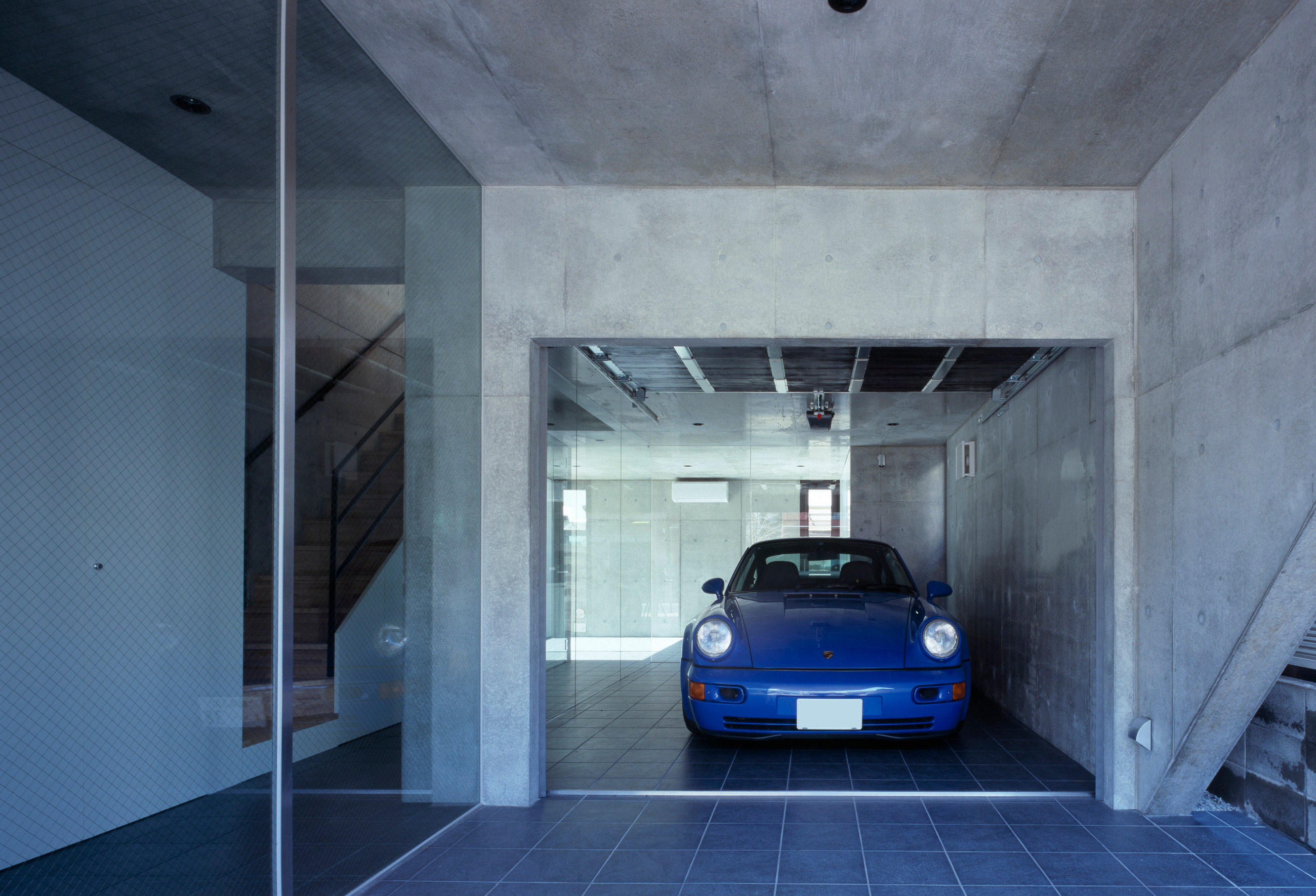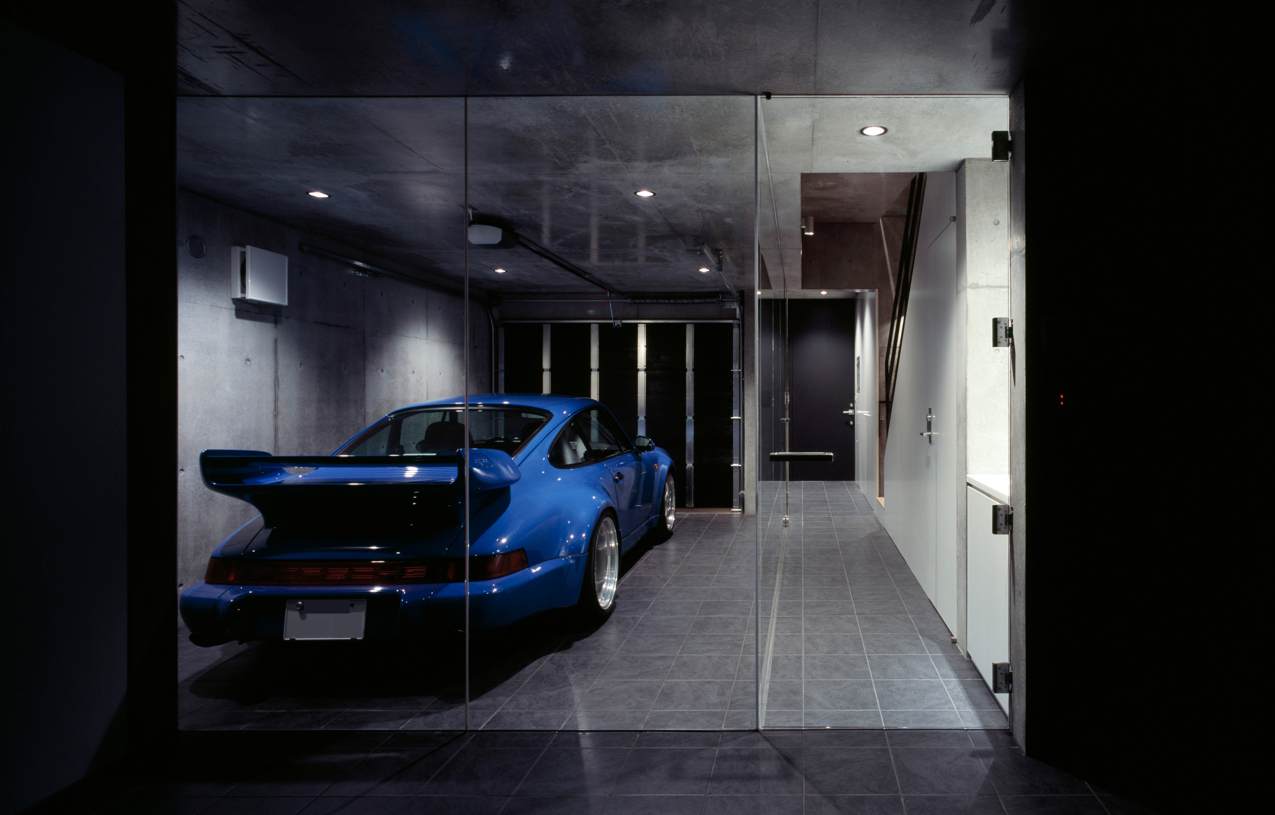 息子さんの愛車ポルシェカレラとBMWがエントランス横のビルトインガレージに格納され、常時メンテナンスも出来る様に工夫されています。