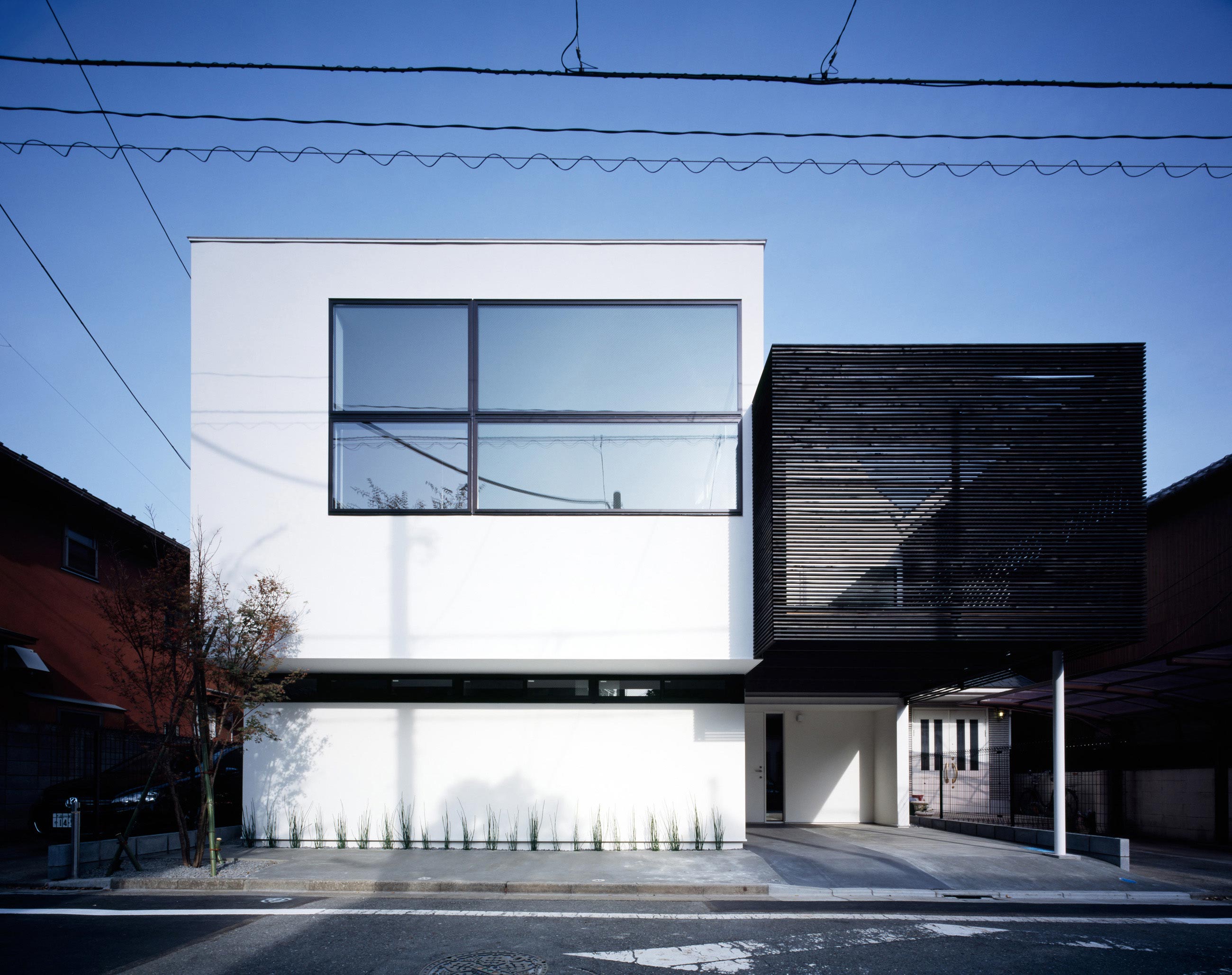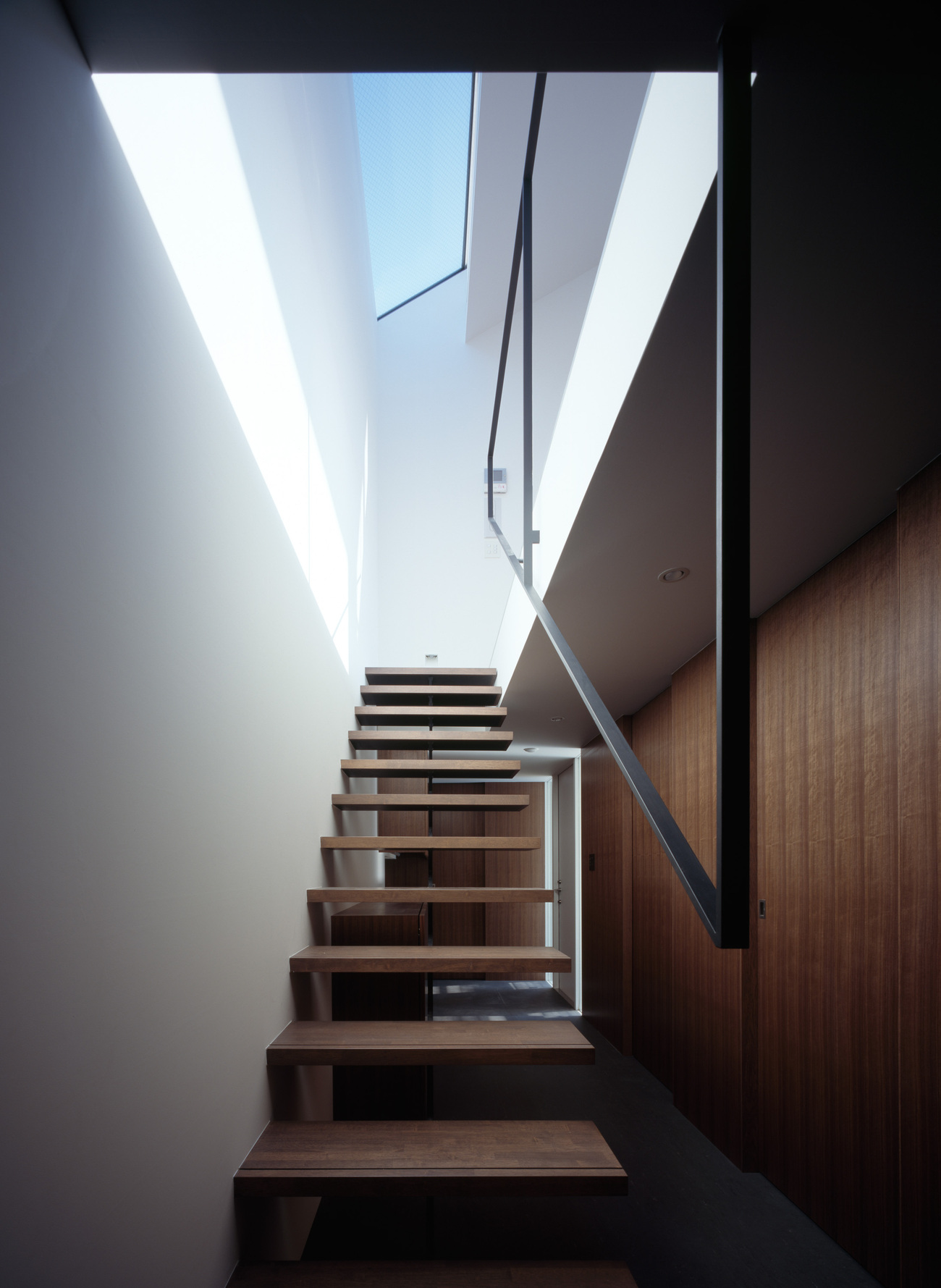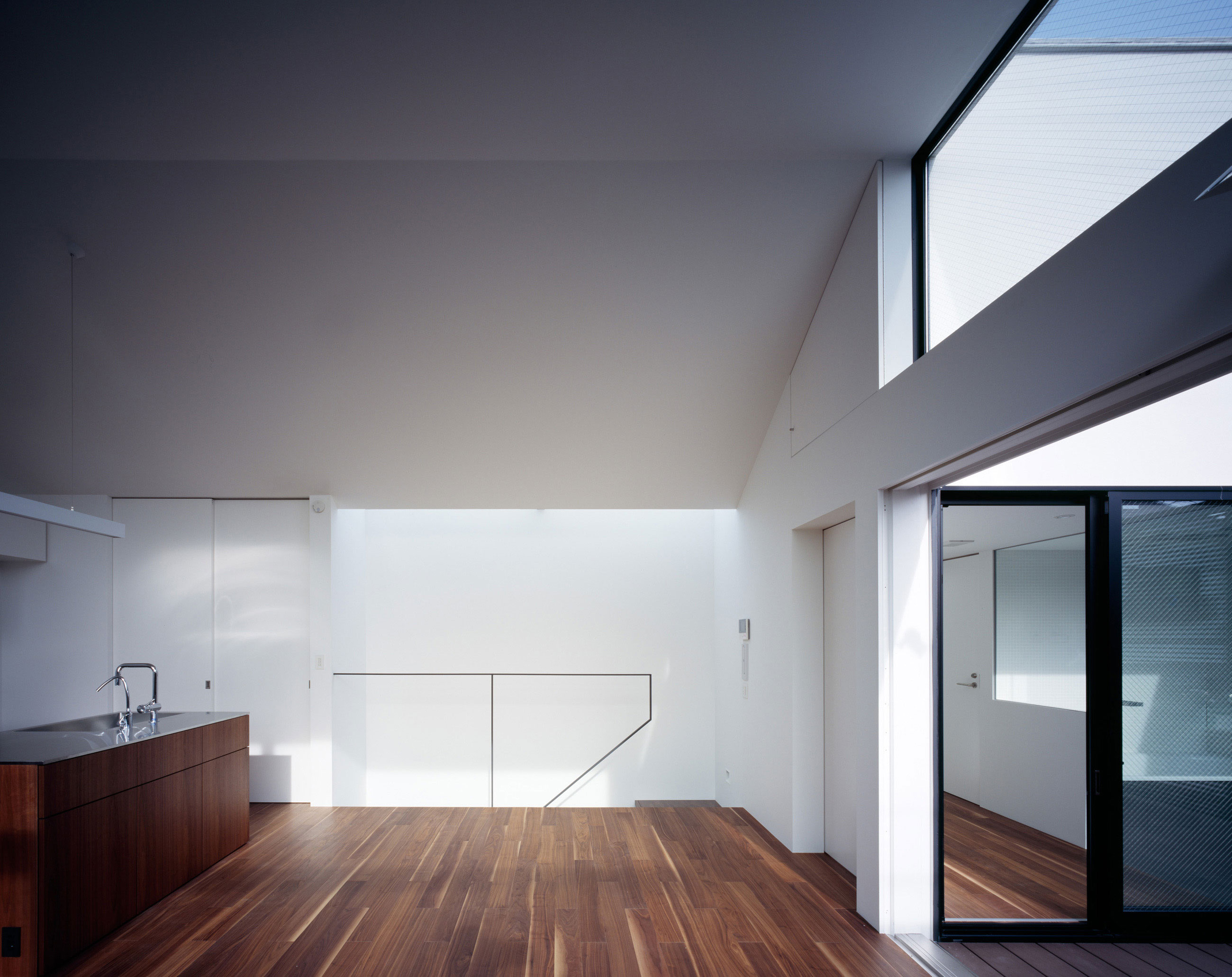 The entrance hall of the first floor lays an earth floor with capacious storage. A symbolized stairwell receiving diffused light from the top produces spacious room in a limited volume. The second floor faces tile flooring with an island kitchen. From the large opening, verdant scenery comes in. At any position you feel the spaceless outside because the water area adjoins the roof balcony. The innovative mural storage and the loft play a significant role in realizing commodious and brief space. The massive volume shifting slightly gives a vivid rhythm in the monotonous street while securing the privacy.