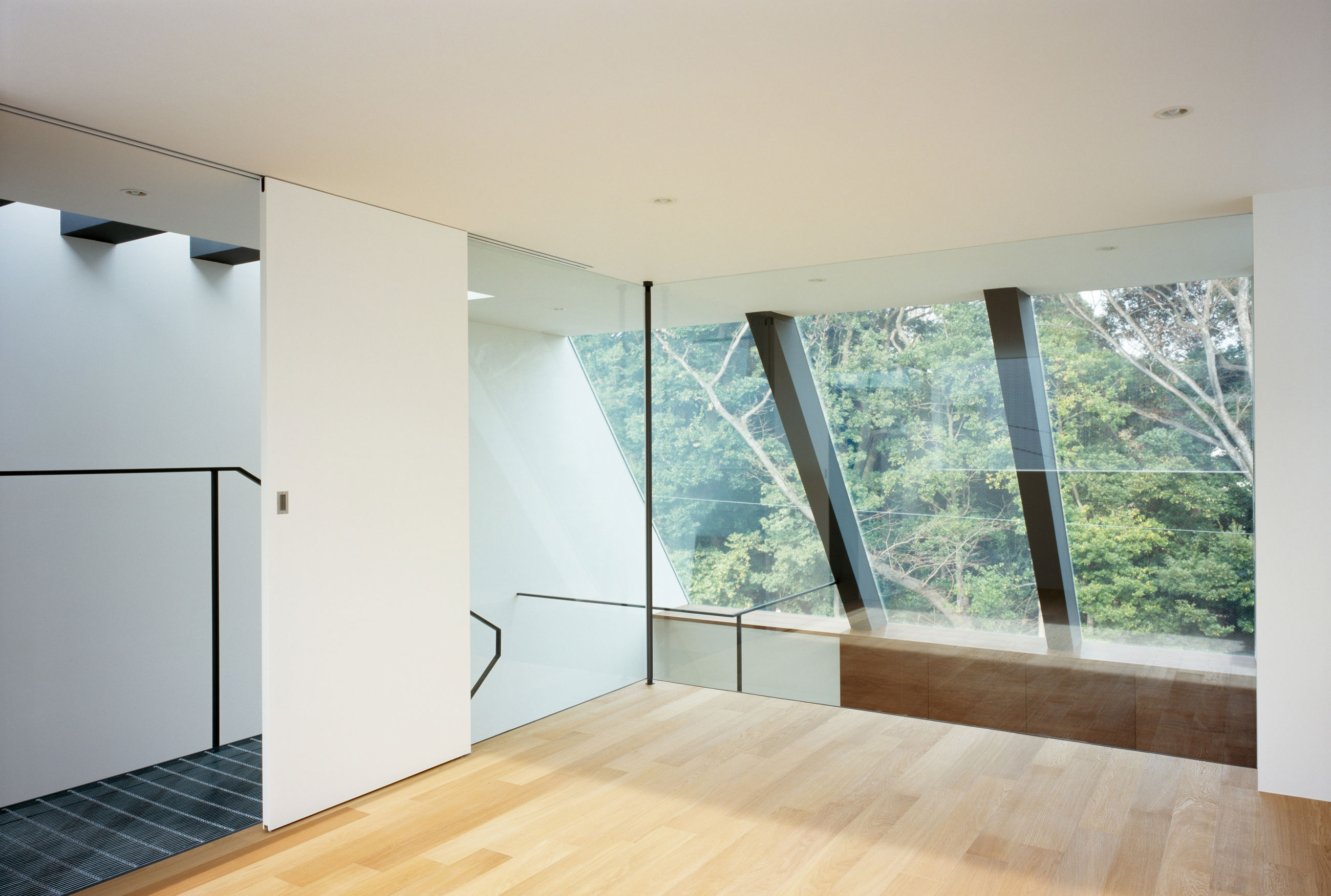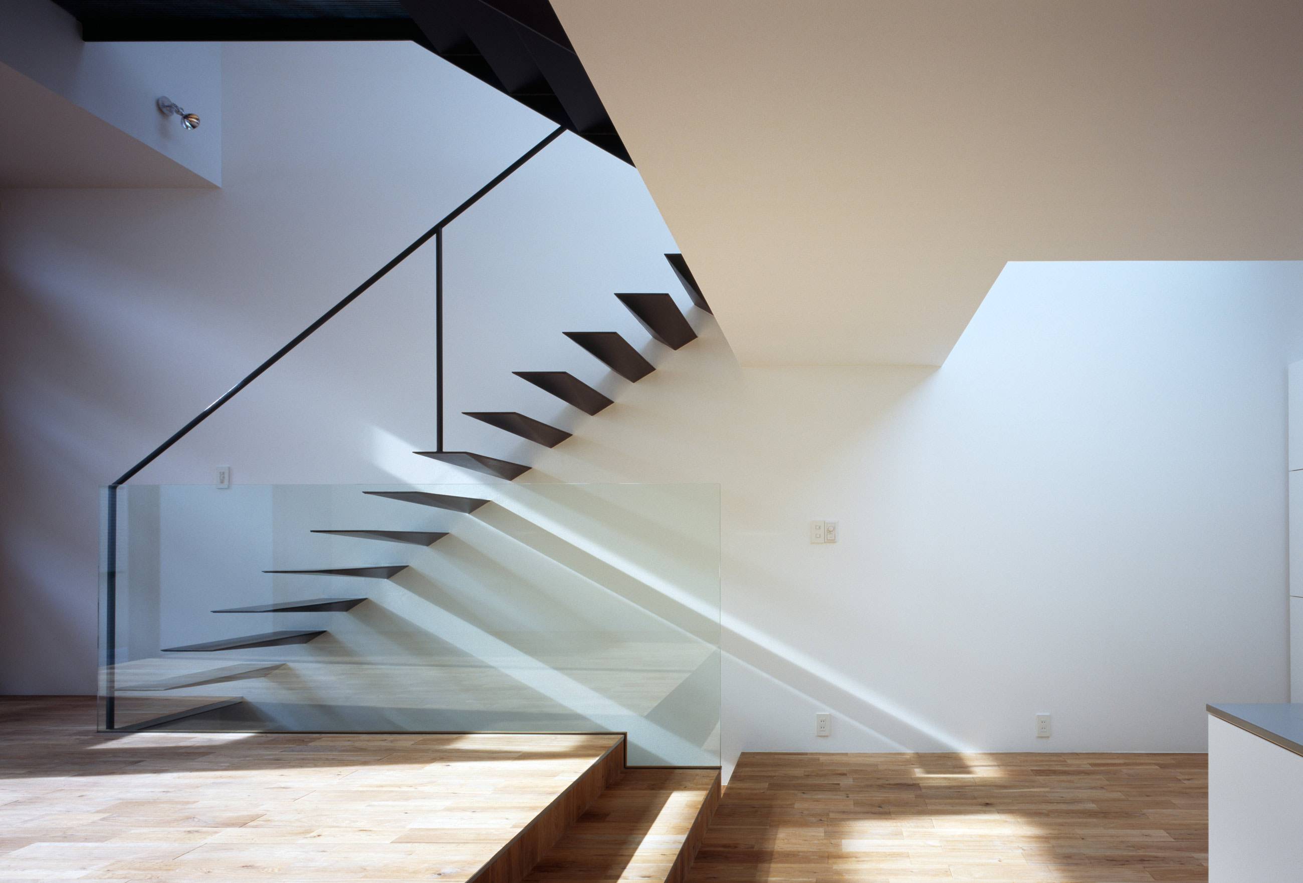 内部は北側斜線の影響を受ける3階の傾斜屋根を生かしたスキップフロアの構成。2階リビングから借景の特等席となるスタディルームや子供室に微妙なレベル差を設けることで室内に浮遊感を生みだしている。北側の傾斜天窓から見える緑景がモノトーンの室内に彩りを与え、光や影と組み合わさることでドラマティックな空間を生み出している。妻側のフルオープンの大開口を実現するために設けた格子状の木造耐力が室内意匠としても程良いアクセントを生みだしている。また、一枚の鉄板を溶接してつくりあげた三角断面のミニマルなキャンティ階段は美しいアートピースとして壁面を彩り、南面大開口や階段上部の天窓からの採光によって美しい陰影が浮かび上がる仕掛けだ。スチールロッドで天井から吊られた子供室はさながらツリーハウスのような心地良さがあり、ステップに腰掛けながら空の景色を楽しむことが可能。コンパクトな一室空間でありながらも、計算しつくした複雑な仕掛けを随所に施すことで、豊かな空間が生まれる。それこそがまさしく日本の都市住宅の真骨頂である。