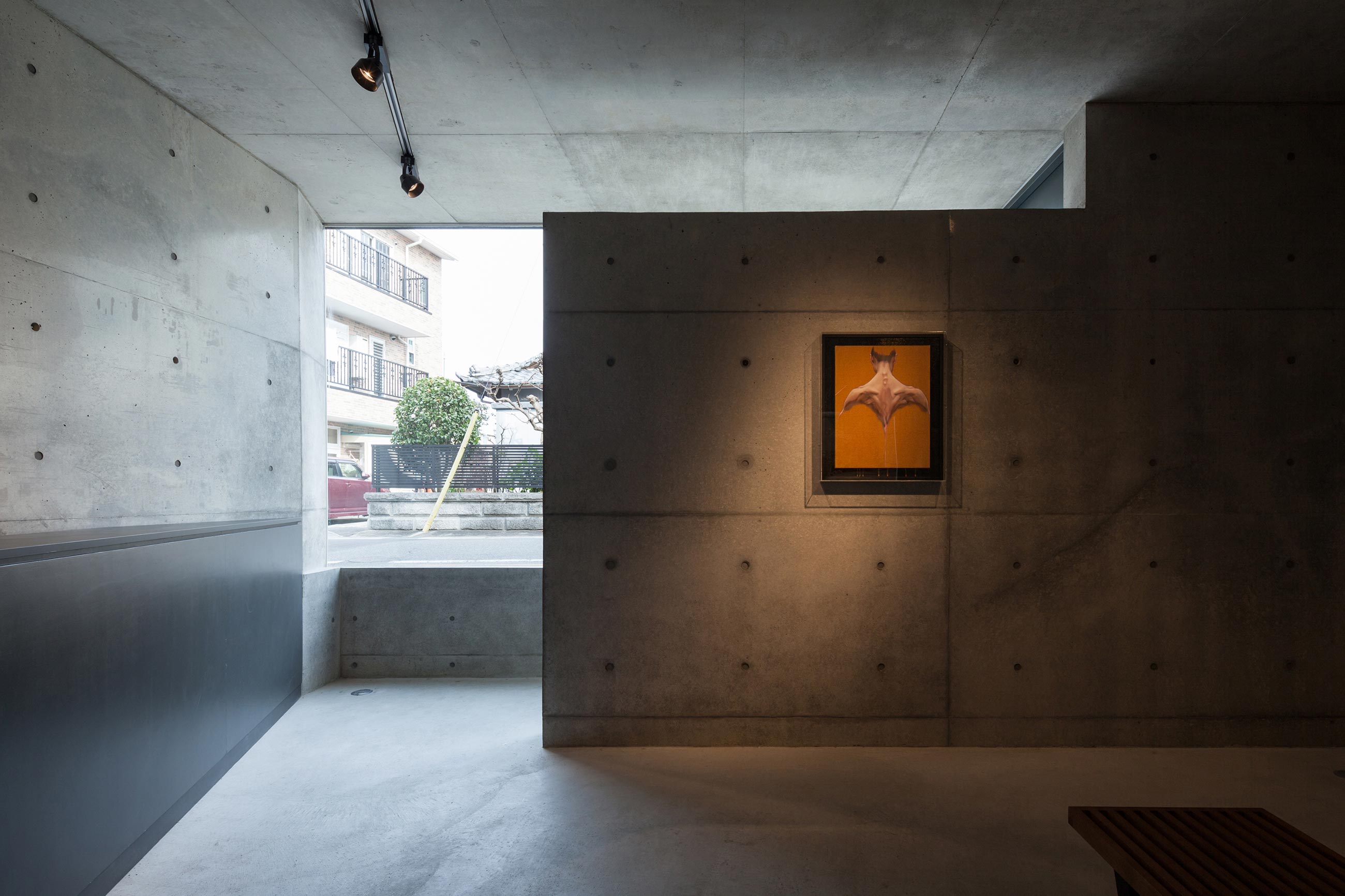 The 2nd floor level is cantilevered, in order to provide a garage space in pilotis style for two cars on the 1st floor level. The 1st floor podium is fully glazed on the street side for giving good visibility of the gallery. The floor level of the gallery space is lowered as a semi-underground sunken space to be magnetic, while a concrete partition provided inside of the space blocks the direct daylight, allowing visitors to the gallery appreciate art pieces via reflected light on the ceiling.