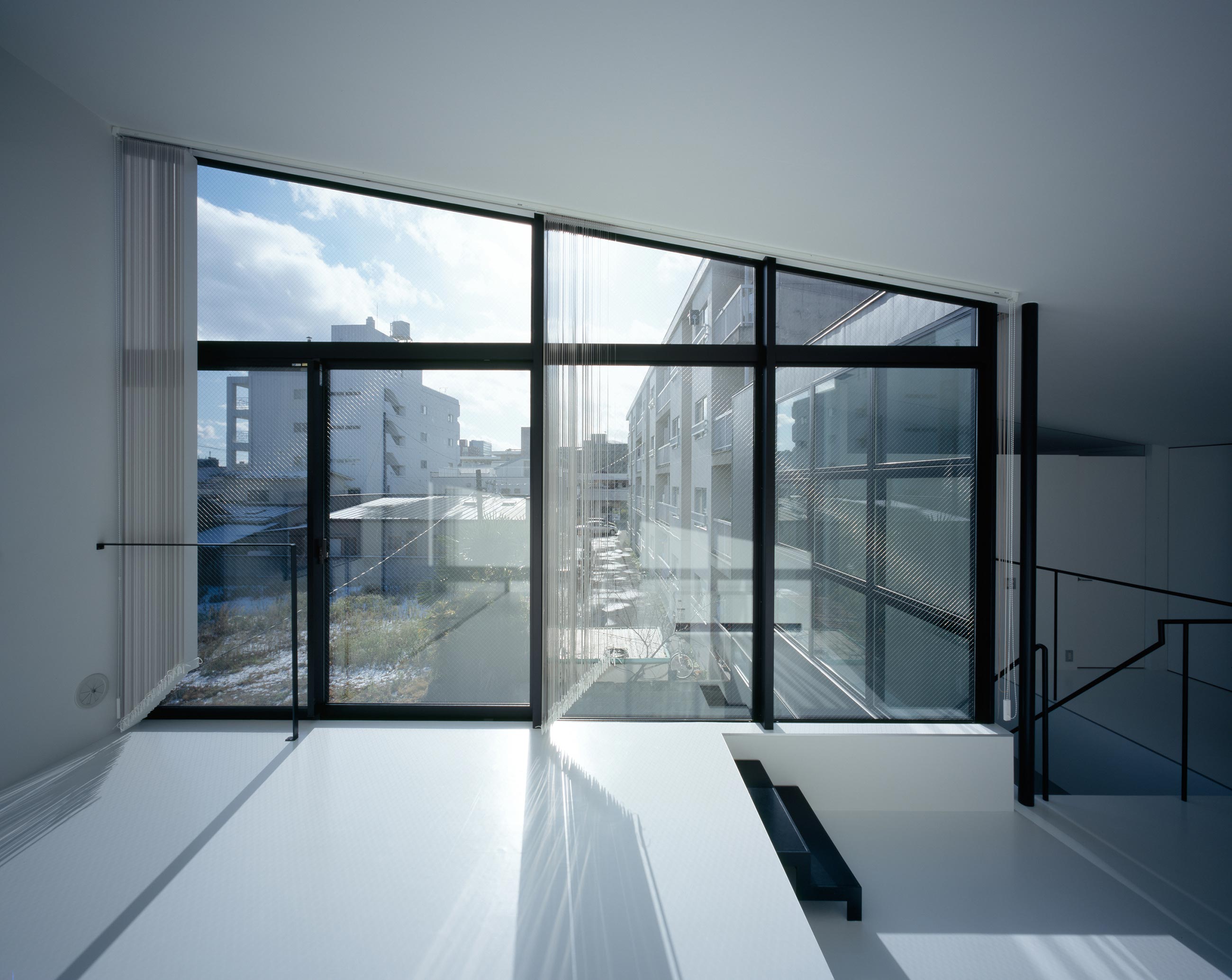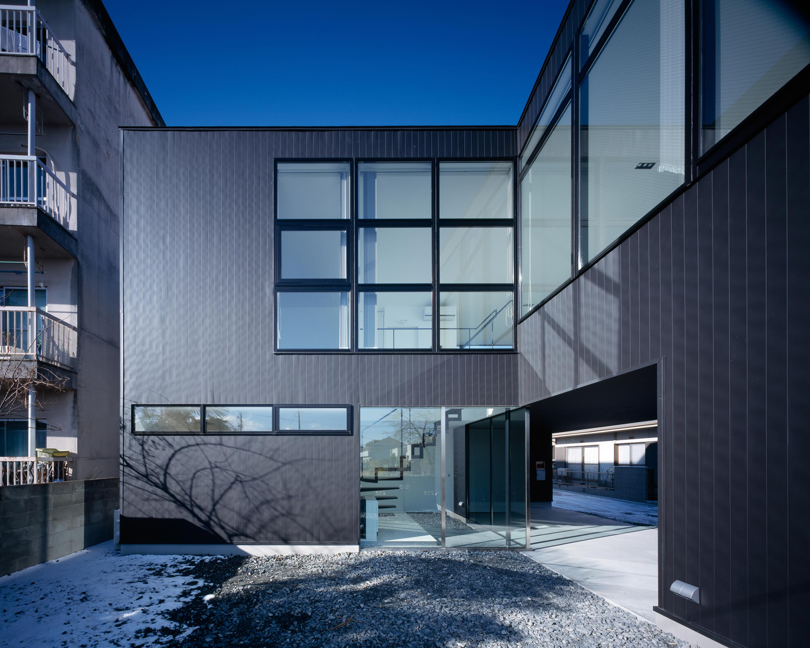 At the plot in the busy downtown Sendai, the surroundings cluster commercial buildings. The plot sets at a corner facing a long and narrow public road. The client works at an advertising company and likes surfing as a hobby and his wife is a famed apparel company agent.