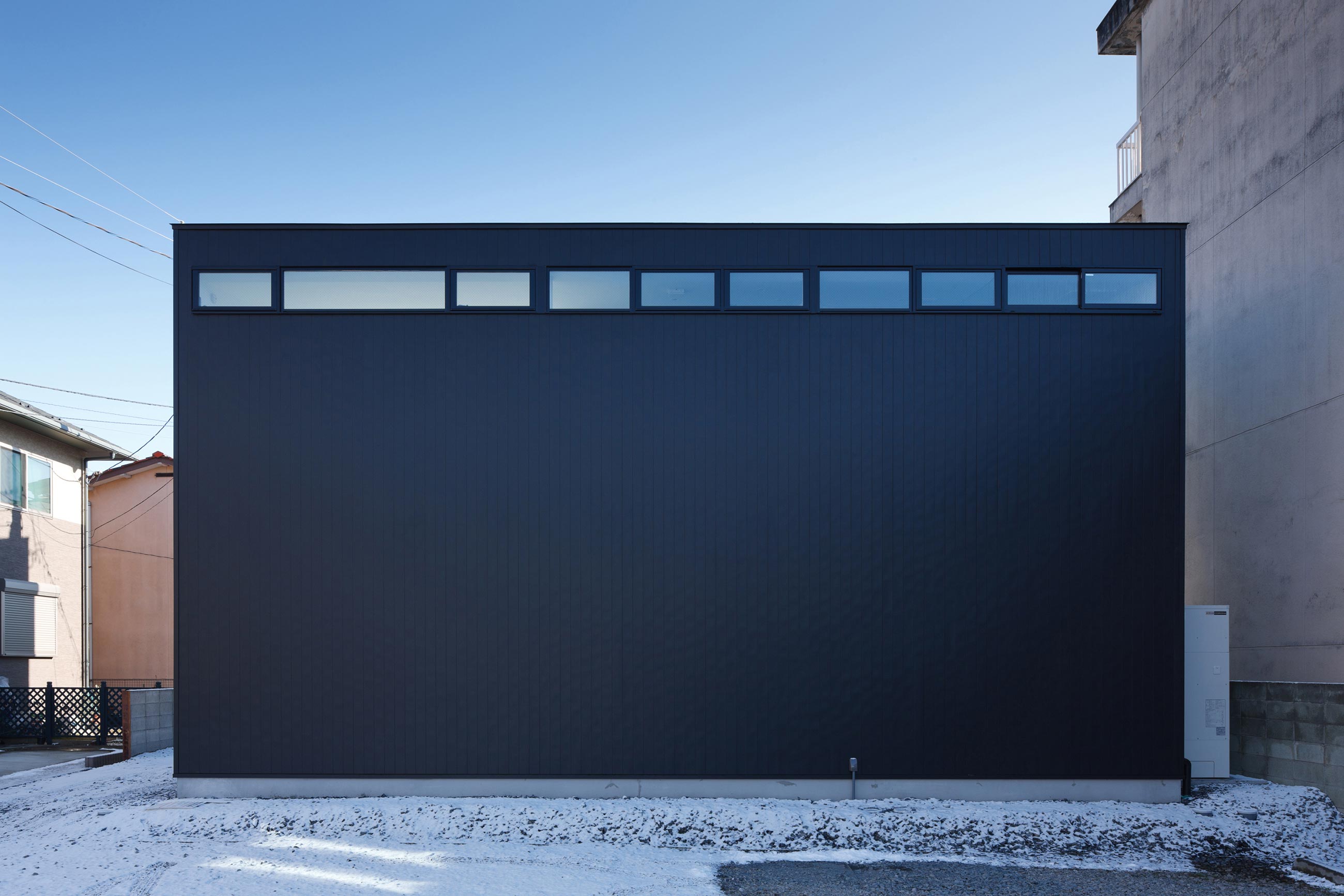 セキュリティーを高める為、道路に面した正面には、横長のハイサイド窓を除いてほとんど開口部を設けず、控え目ながら凛としたファサードをを実現しました。