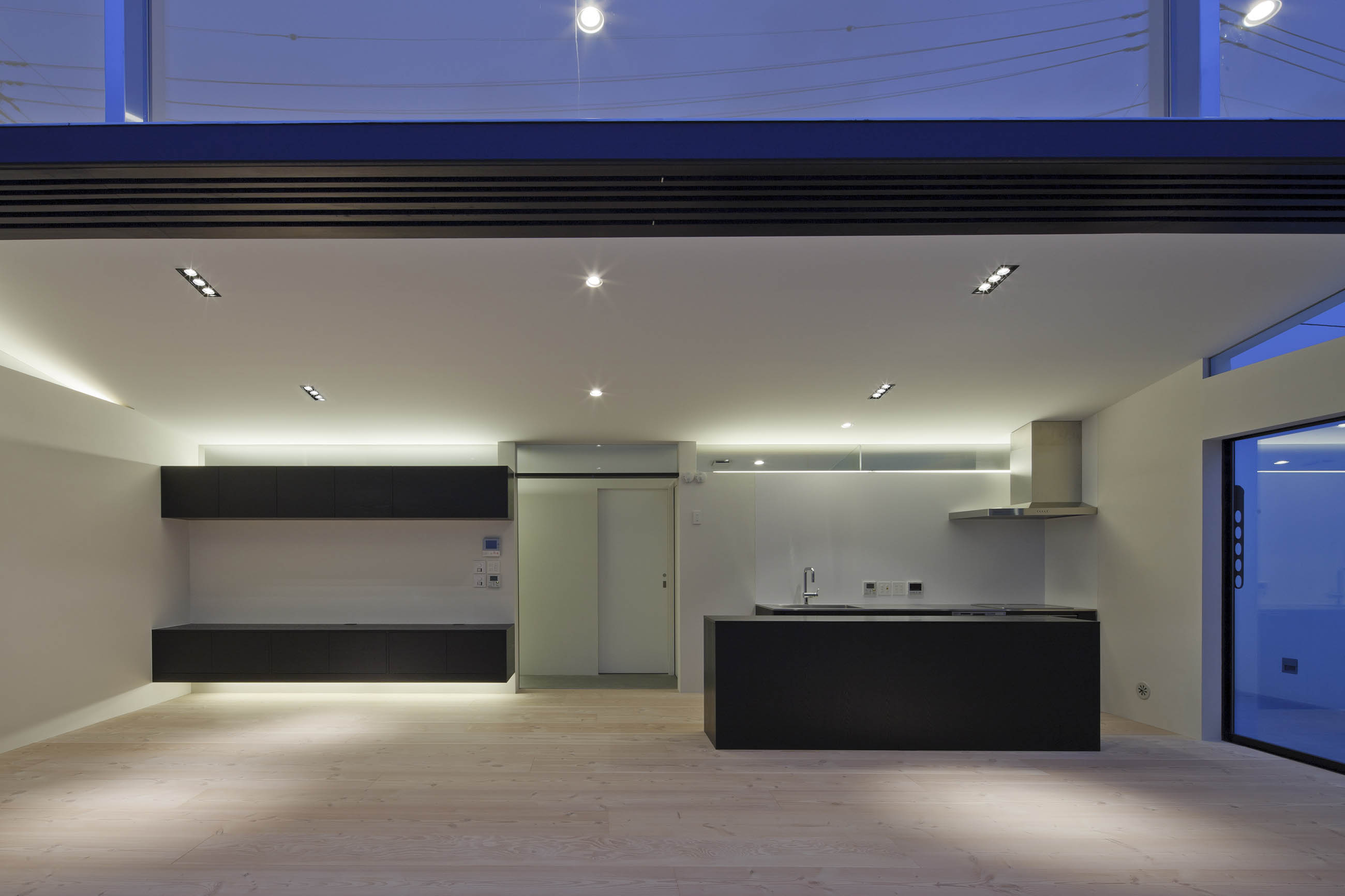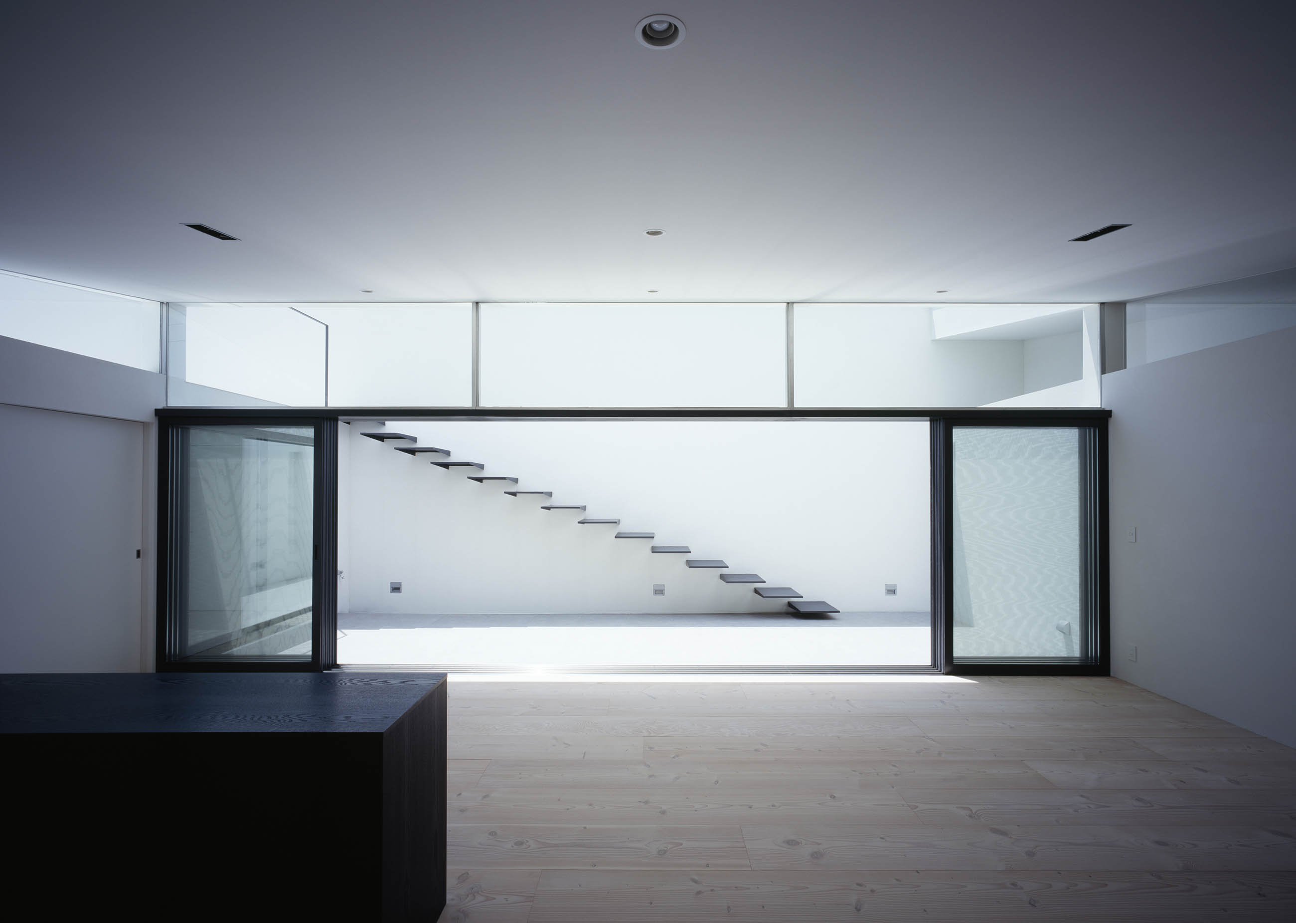 単純なワンルーム空間に陥らないために必要なものは「物語」であると考える。門扉を開けると現れるスリット開口からはプライベートの中庭が少しだけ見える仕組みとした。細長いポーチの先には透明ガラスの玄関ドアがあり、その先にあるトップライトからは柔らかい光が室内に注ぎ落ちている。