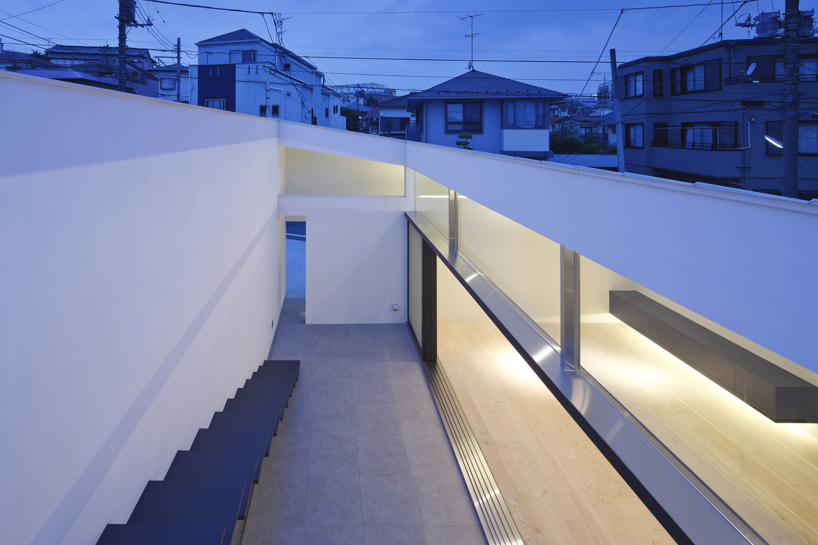 Turning at the edge toward from the entrance, a long approach awaits and functions as a switch of in and out. Via the water area, the approach continues until the bottom yard to secure a capacious motion. The main room holds ample space to embrace a luxury sofa, table and a counter kitchen to tie as one unity. A large terrace is arranged next to the main room with the scenery of the symbolized cantilever steps. The security and abundant light is well secured through 4.5m ceiling height volume. The terrace in the middle, two bedrooms face mutually in right angel and each of the family feel presence in MUR.In contrast to the simple white exterior, the inner space features just like a Parisian apartment with a symbolic tree in the inner yard.