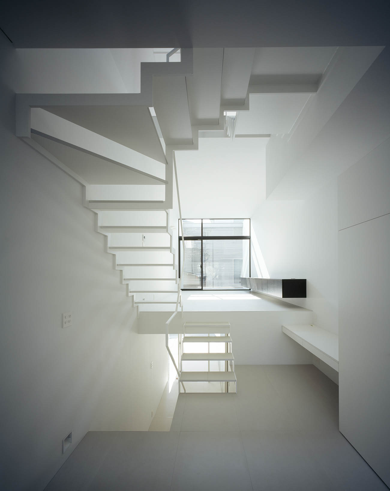 Deep perspective plot with a narrow width is sandwiched by two streets thus we had found a passage of deep visibility and warm wind. From the front street, in order to keep the privacy, the facade is covered up with series of horizontal materials. NID has a unique characteristic in its complex section. Skip floors slide up and down, and connect each floor gently. Each space somehow adjoins the exterior to absorb various views. The top floor holds a fully private, traditional Japanese-style room.