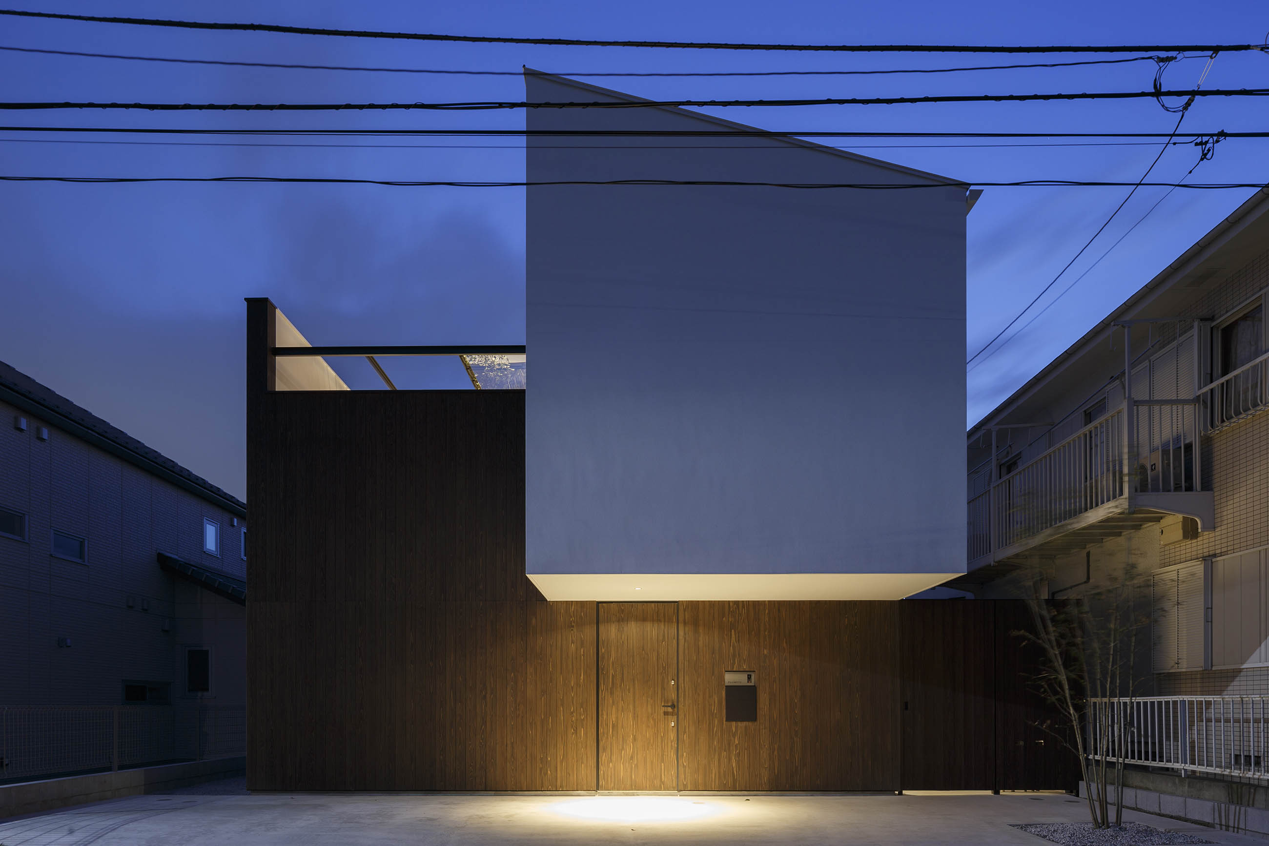 Our client, a DINKS couple with profound knowledge of architectural design, acquired a lot within a quiet residential are in Kawasaki-city, Kanagawa–for realizing their own residence with a patio space by reflecting their own taste and interest in its design. The contrast between the exterior wall covered with red cedar strip flooring pieces in dark brown color and the white volume stuck out at the second floor level promotes striking impression of the exterior design.