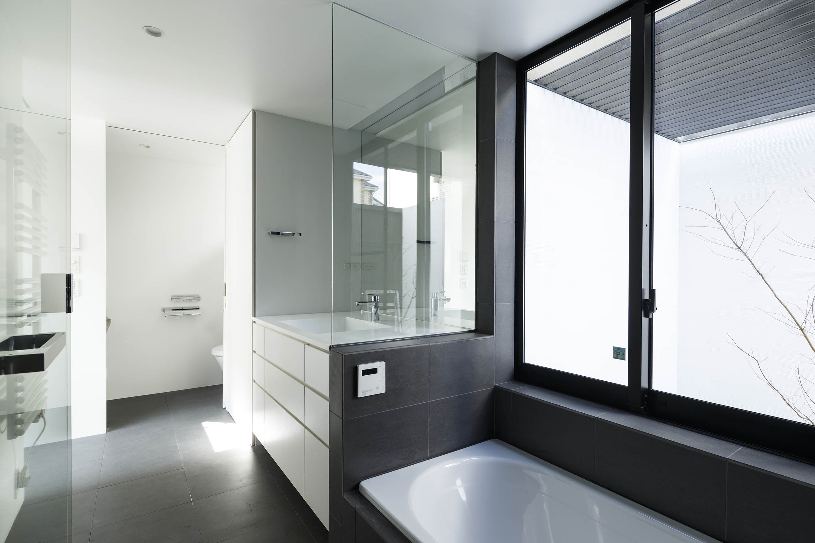 In contrast to the exterior with confined expression, an airy patio space filled with natural light rests inside as the core of the interior spaces. This patio space enables easy and casual access between the Japanese-style room with tatami mats adjacent to the entrance, and the main bedroom situated opposite to the Japanese-style room across the patio. A Body-care room is provided continuous to the open area next to the bathroom, in order to provide a unified space with relaxing atmosphere as well as a smooth circulation for housework.