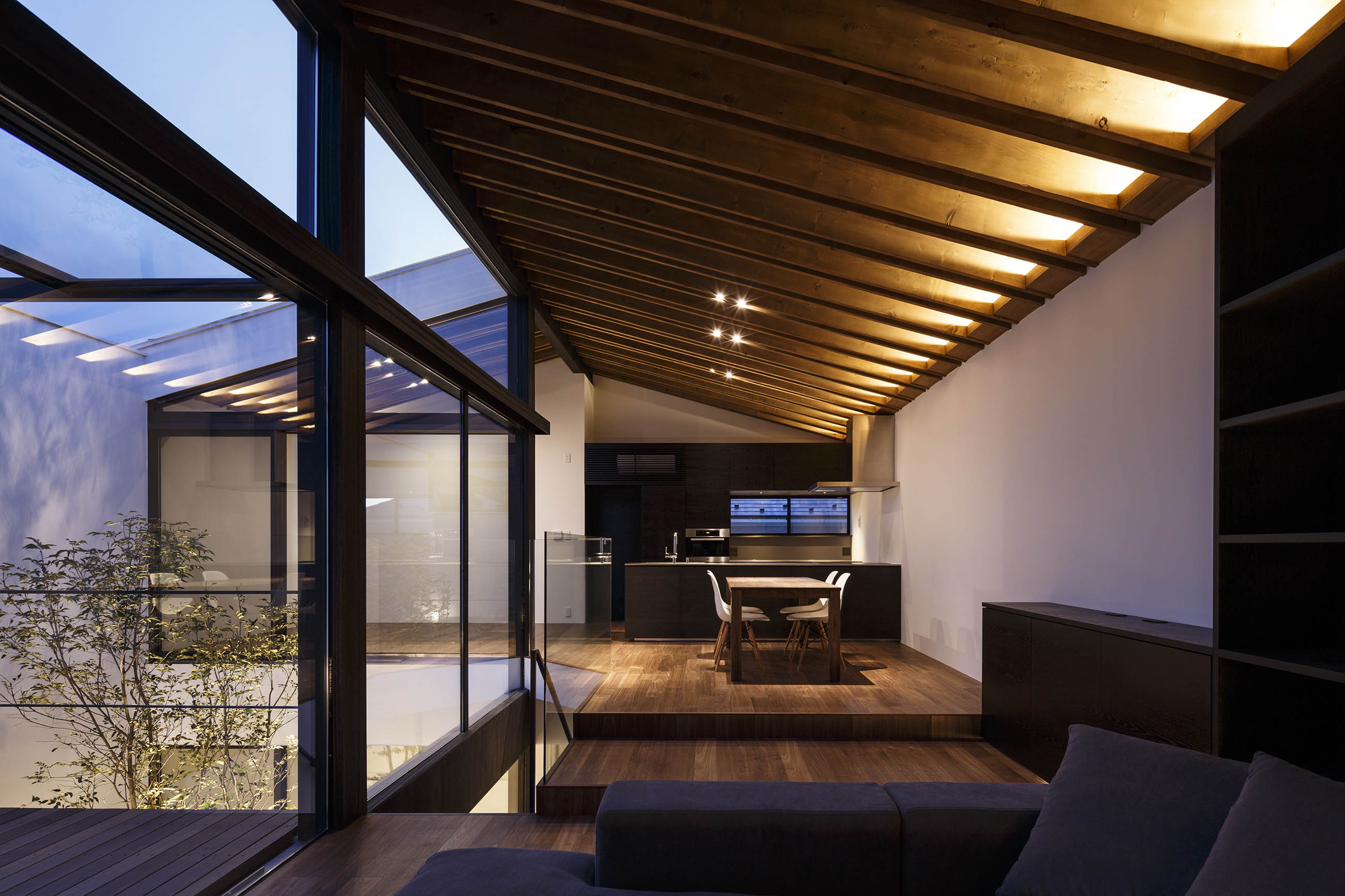 Built-in furniture is provided next to the living space for storing books and record disks for hobby use, while large sliding doors are installed for the unity of this area with the exterior living area. The dining kitchen area is situated on a raised floor, allowing gradual separation of the dining kitchen from the living area, along with some theatrical aspect of the space.