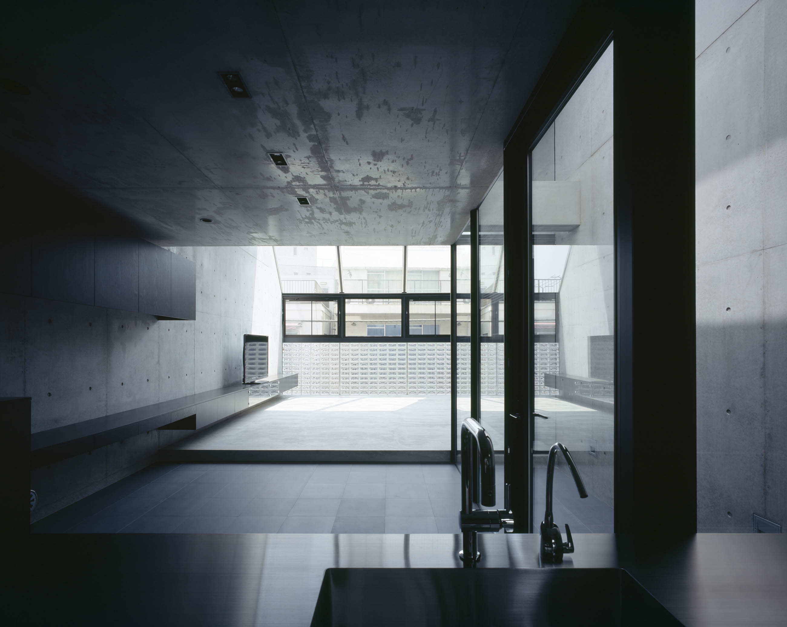 敷地は商店街に面する商業地域で、今でも古い商店や工場が立ち並ぶ新旧が混在するエリアの一角です。中層ビルやマンションに囲まれた敷地は十分な採光や換気が期待できず、借景もさほど望めません。それゆえ、外的要因に影響されることなく、いかに建築内部に光を取り込み、空に対して空間を開放できるかが課題になりました。