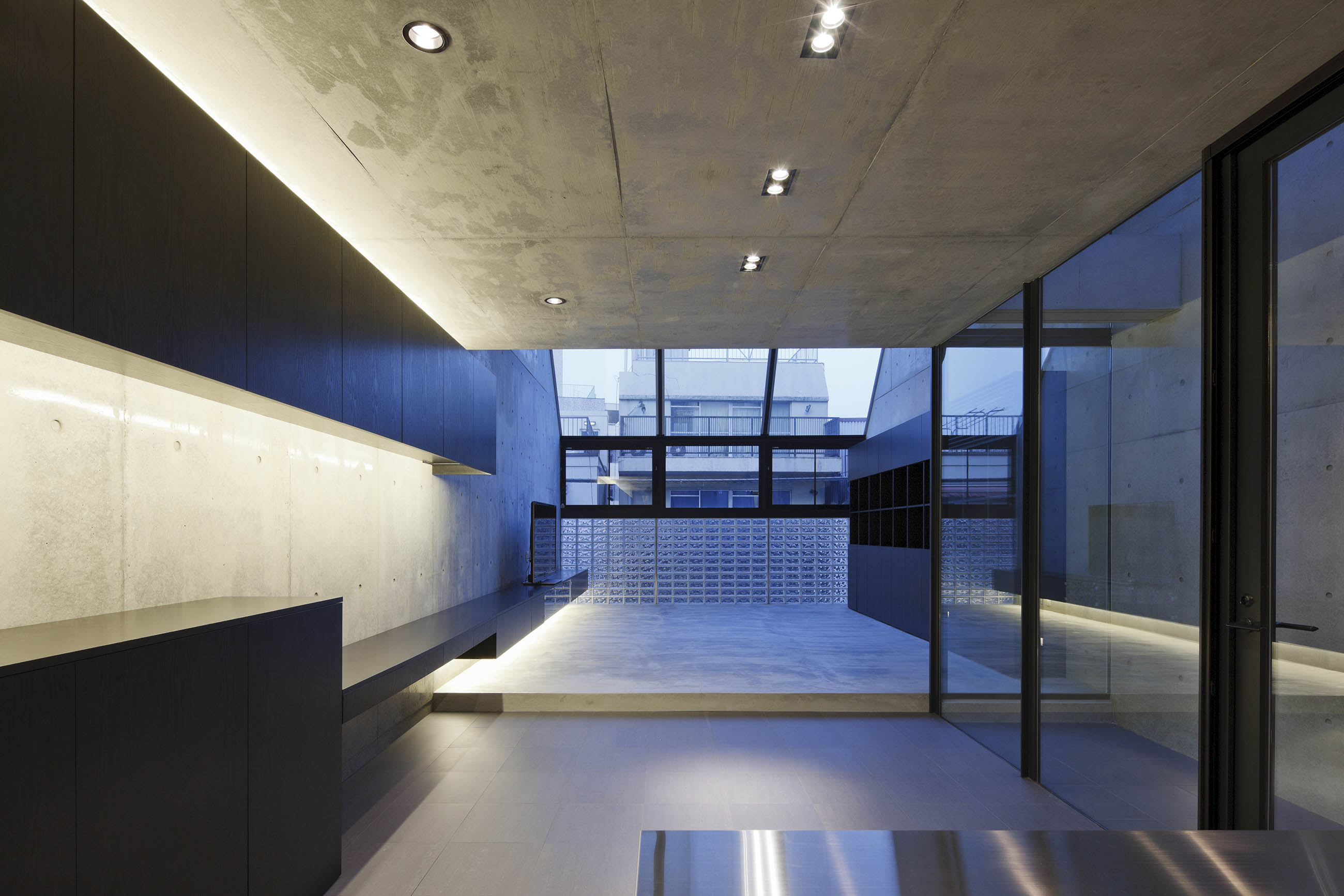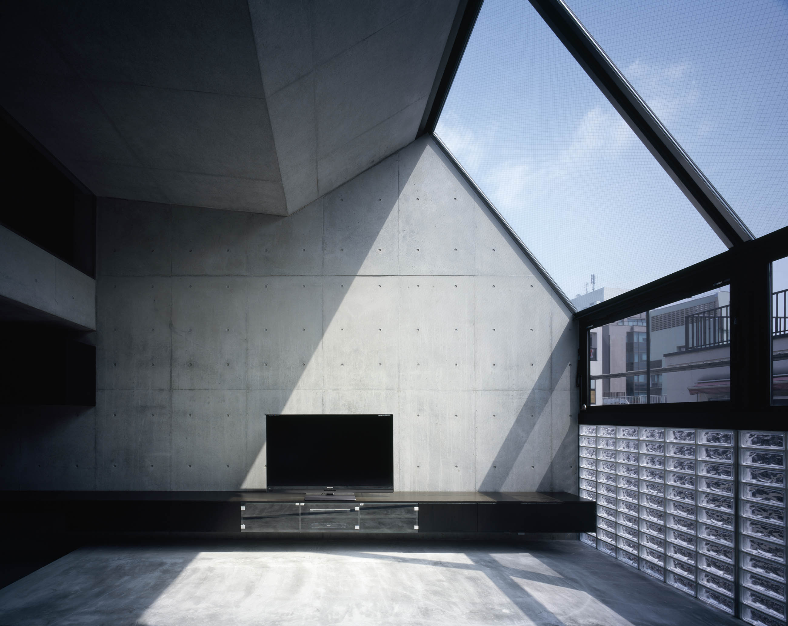 The plot locates in a commercial area just around a highway. The vicinity is mixed with new and old stores and factories. The plot is surrounded by medium-size buildings and apartments which assign us a hard task of how to deal with sunlight. The facade consists of the combination of glazed blocks, sharp sashes and top lights. The diagonal wall on the frontage shapes an unique proportion.