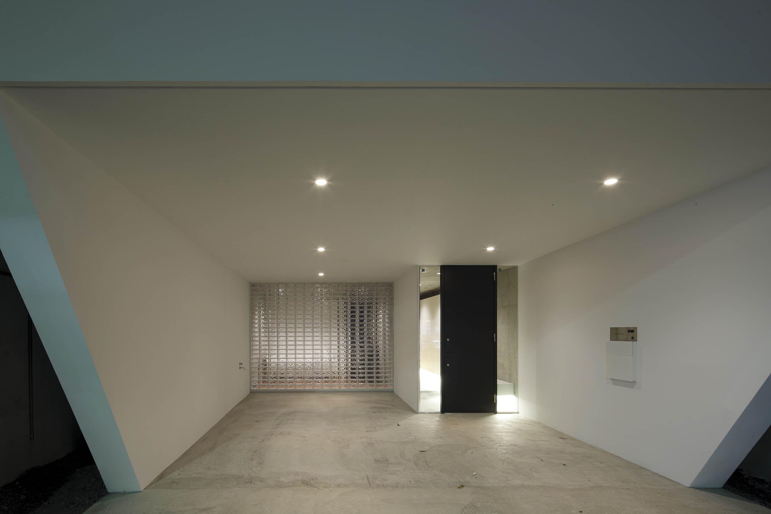 モノトーンで統一したクールなインテリアと同調すべく、外観は横長のガラスブロックとシャープなサッシュと天窓の組み合わせで構成し、快適性や耐震性を重要視してRC外断熱としています。ピロティガレージ横の壁面がカットされた特徴のある門構えは端正でありながらも、街並みに遊び心を与えています。
