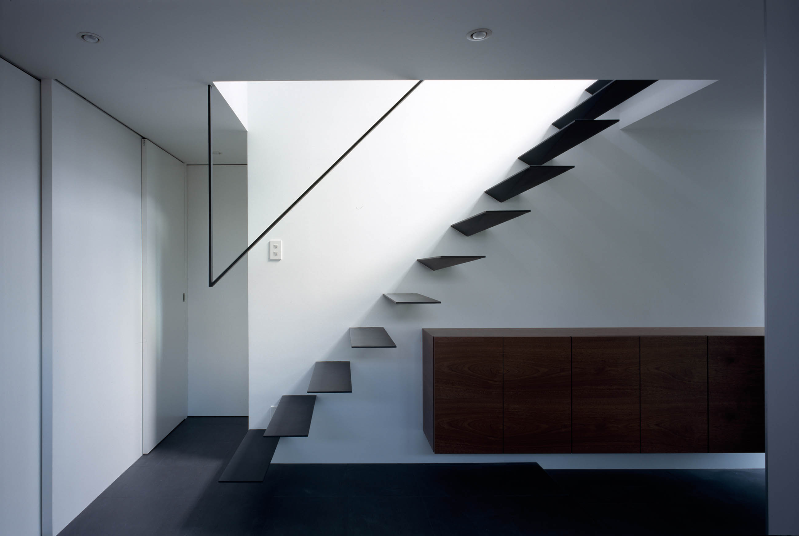 The first floor with slit windows lays a kids room, a main bedroom and a water area while the 2nd floor resolutely sets a family room with a large opening. Taking the privacy into consideration, we adopted a court house with entrance attached and the wall encloses the south opening.