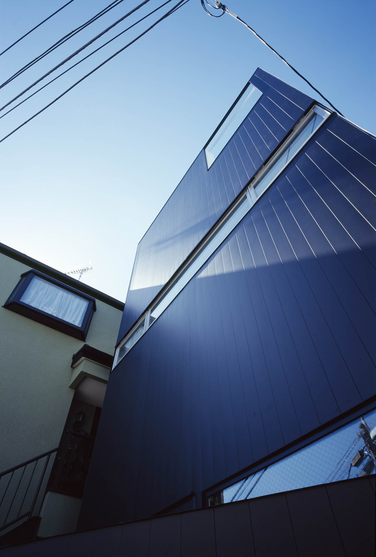 北側道路に面する黒いガルバリウム鋼鈑で仕上げられた外壁はさながら要塞のようで、スリット窓とくり抜かれた窓がリズムをつくりだしてします。
