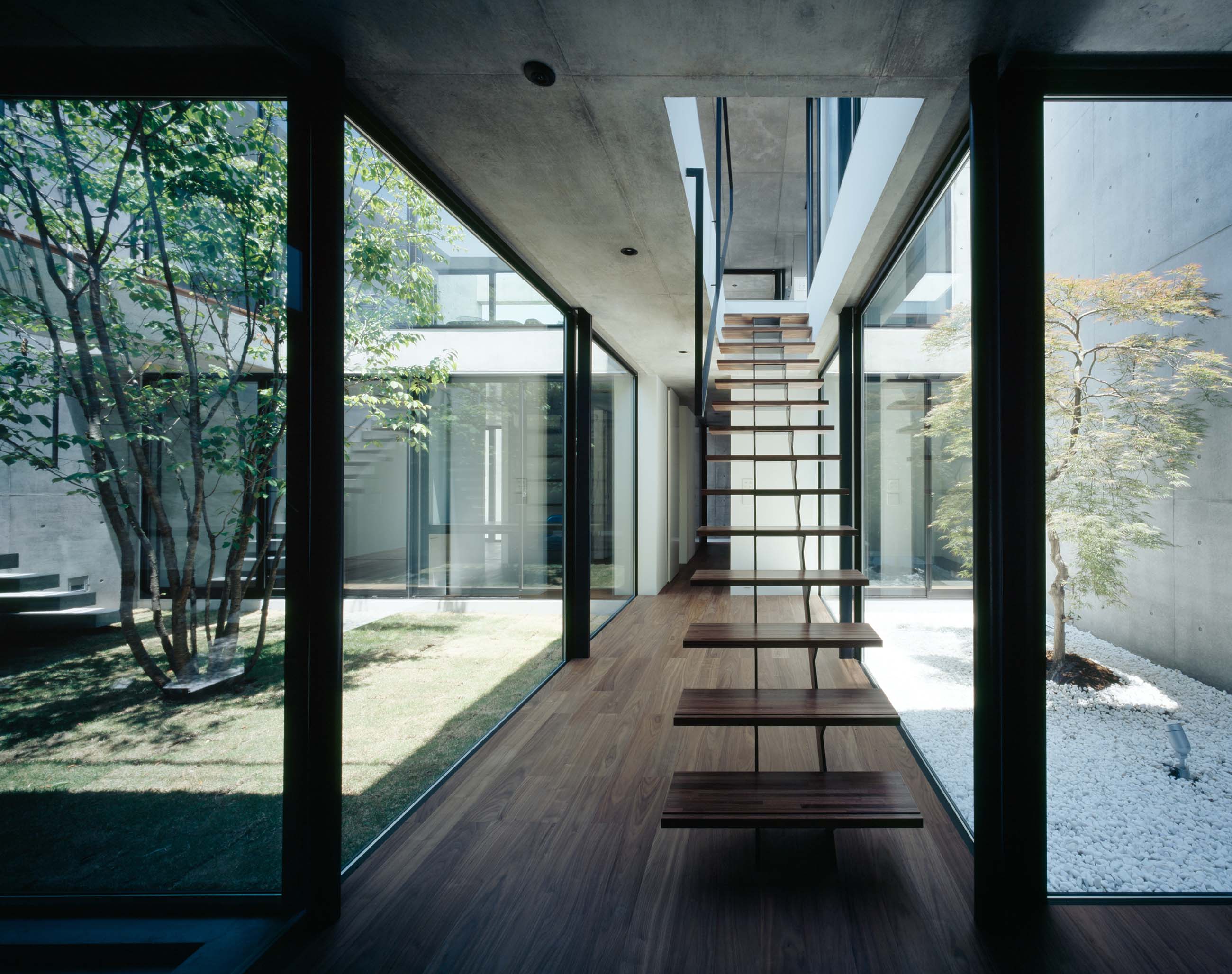クライアントが100坪の敷地にこだわったのは家の中心に大きなシンボルツリーのある中庭を望んでいたため。そこで、玄関ドアの正面に紅葉を眺めるエントランスコート、中廊下を挟んだ反対側にはメインコートを、そして敷地奥にもバスコートを設けることで様々な庭の表情を楽しむことができる。