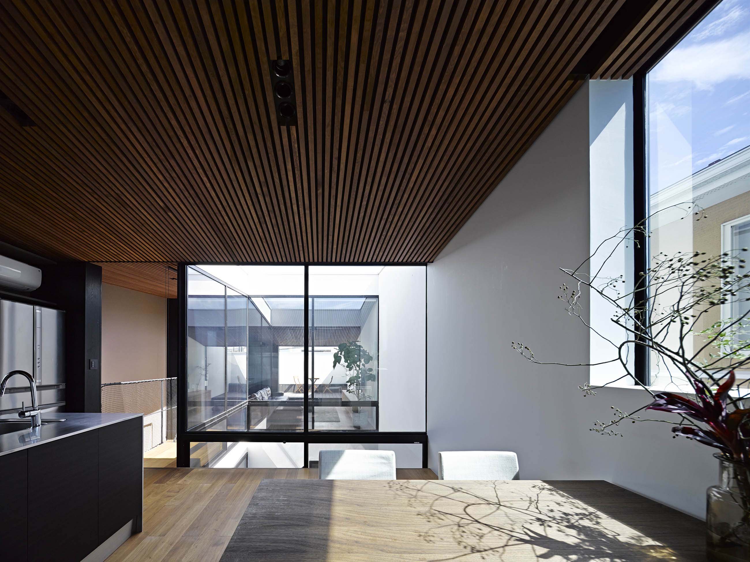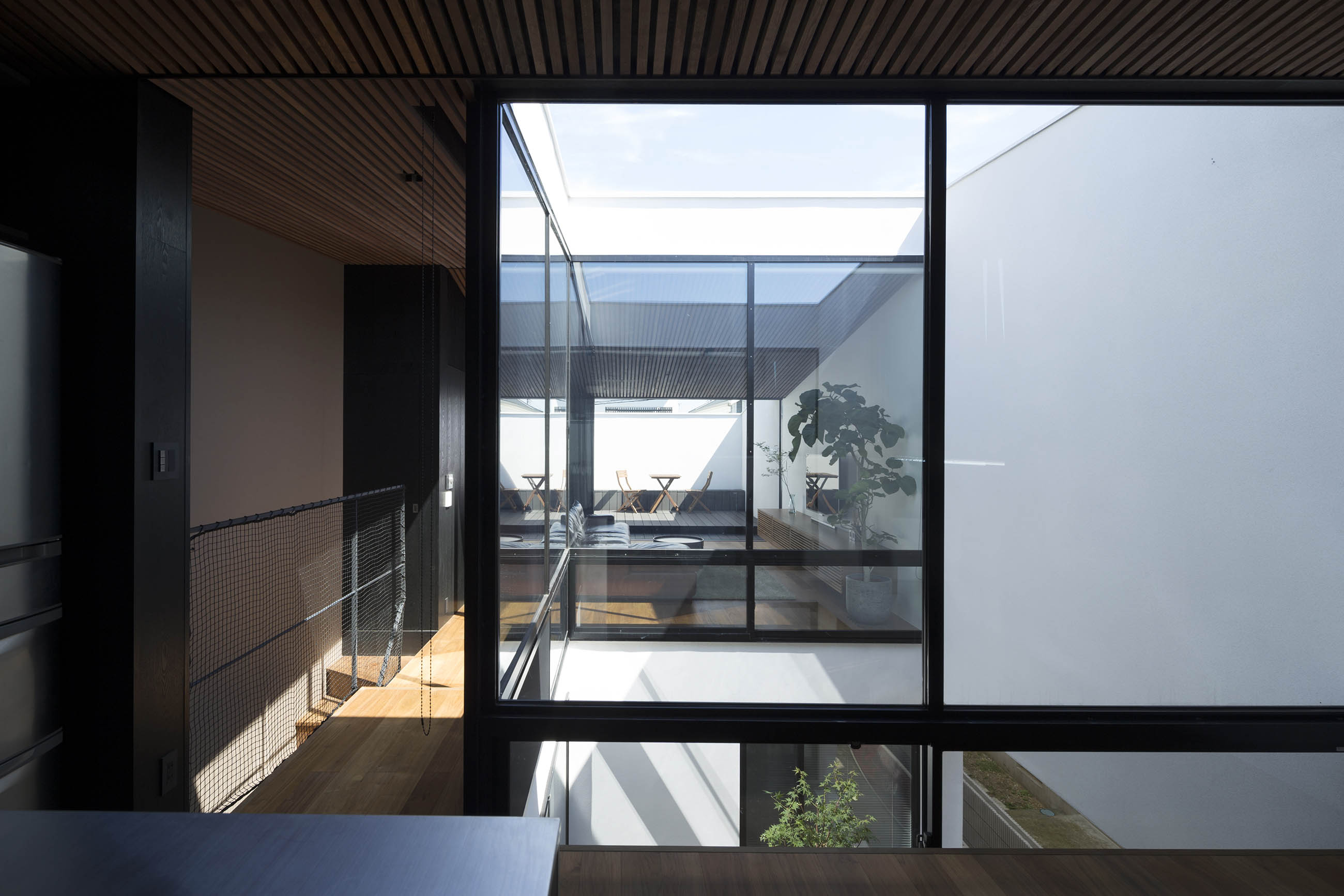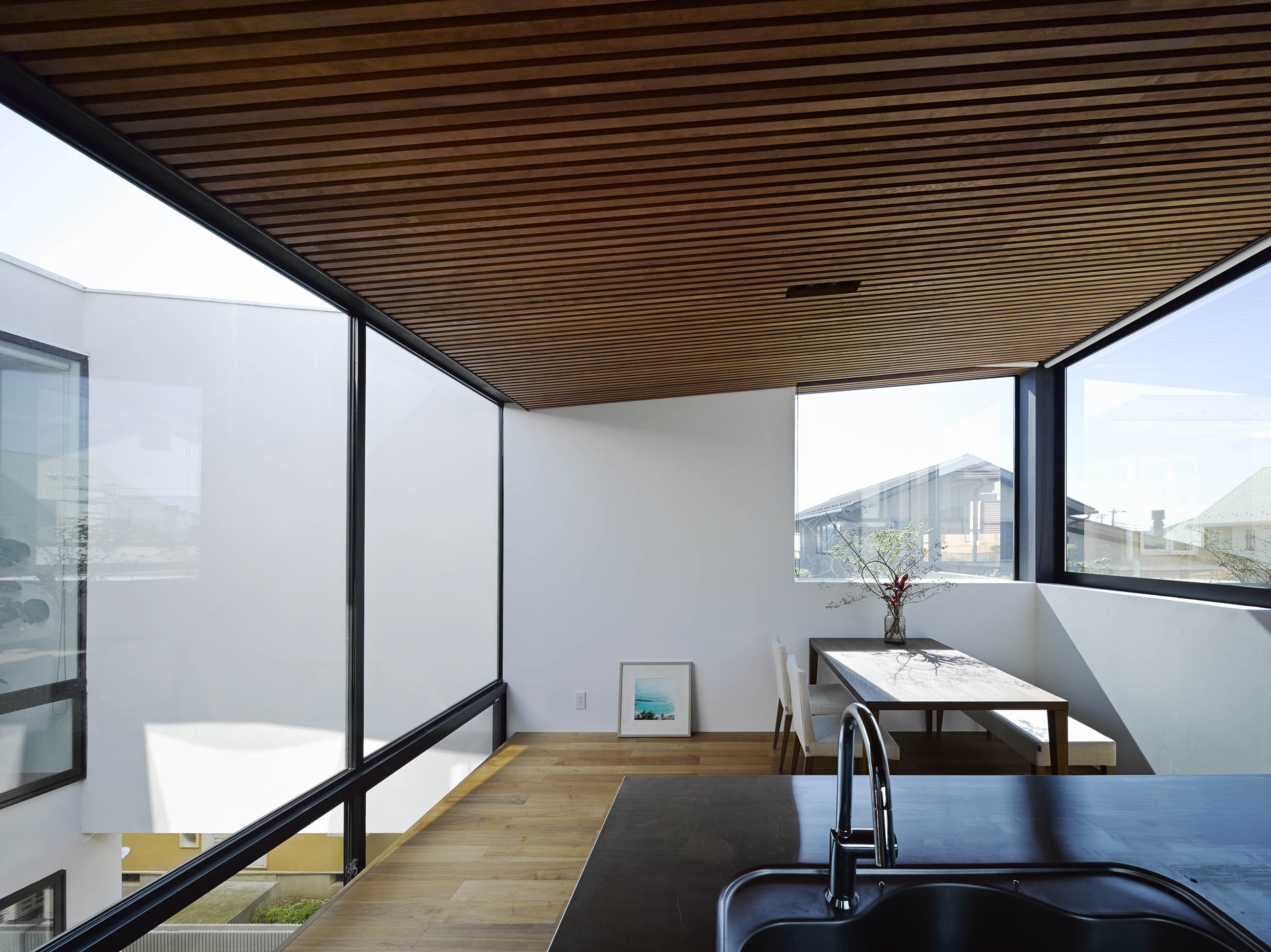 プライベートルームを配した1階とは対称的に、2階はシンボルツリーのある中庭を取り囲む大きなワンルームのコートハウスとした。敷地奥にあるキッチンは使い易い対面型とし、コーナーサッシを配したダイニングルームとの親密性が確保できる。