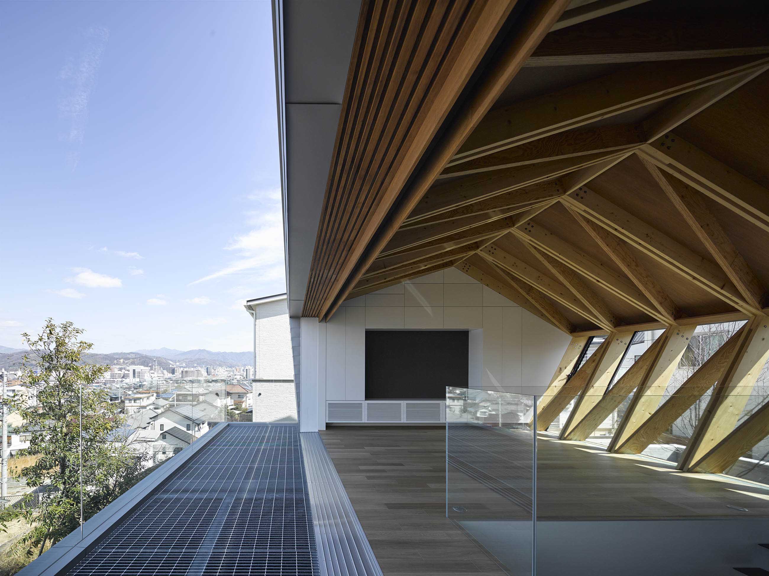 By going up the staircase, the structural body unifying the walls and the ceiling of the second floor is gradually revealed. Repetitive triangular structures composed of SPF timber and laminated veneer lumber rise up from the floor to continuously form a column-free, shell-like space by integrating the wall, the ceiling and the eaves in three-stepped couplings.